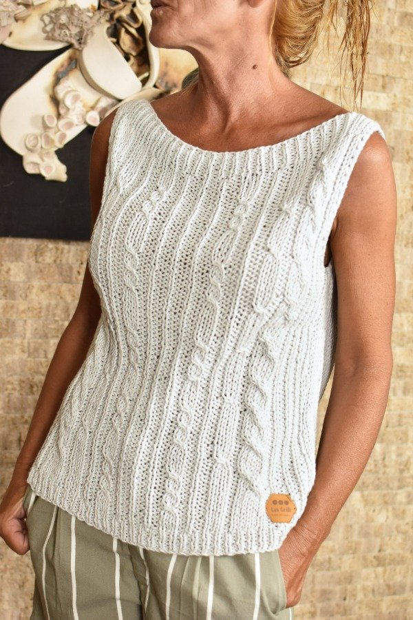 Nueva musculosa, teijda A MANO con hilo sedificado PREMIUN super suavecito y liviano. Diseño de trenzas precioso, adaptable y cómodo! El escote bote con algunas vueltas de elástico le da un toque sofisticado para cualquier ocasión. Es una musculosa que queda muy hermosa puesta, en este caso la combinamos con nuestra NUEVA bermuda RAYADA de algodón color EUCALIPTO y dio como resultado este conjunto super delicado y hasta formal!