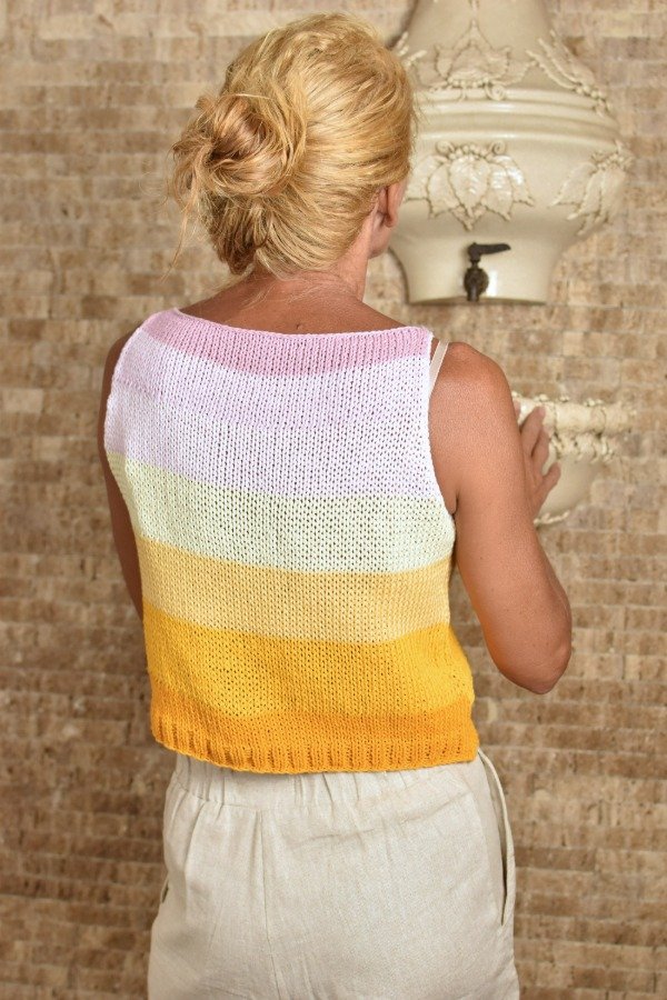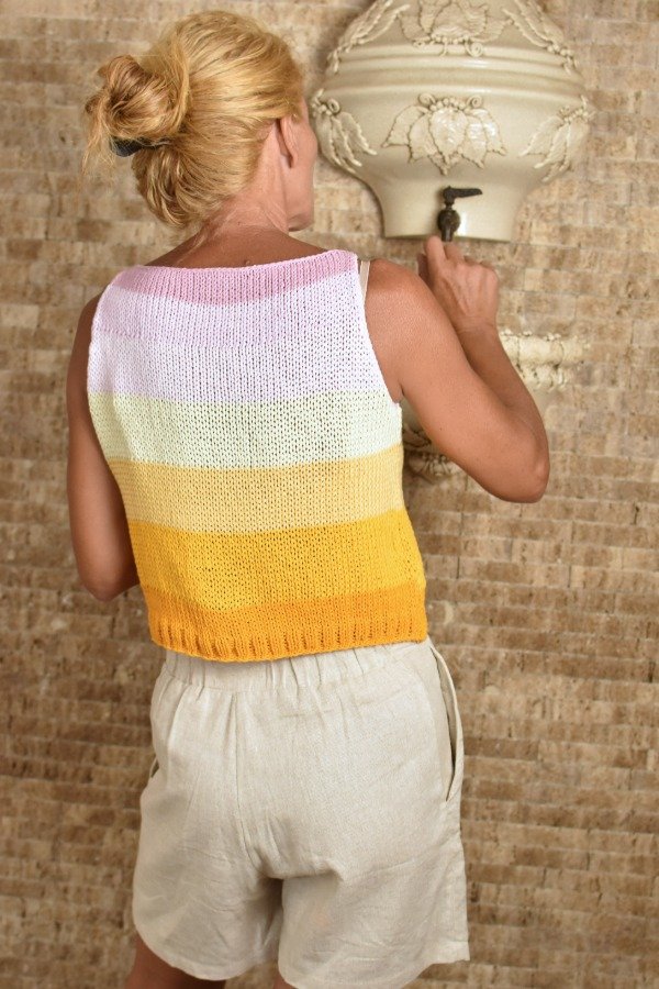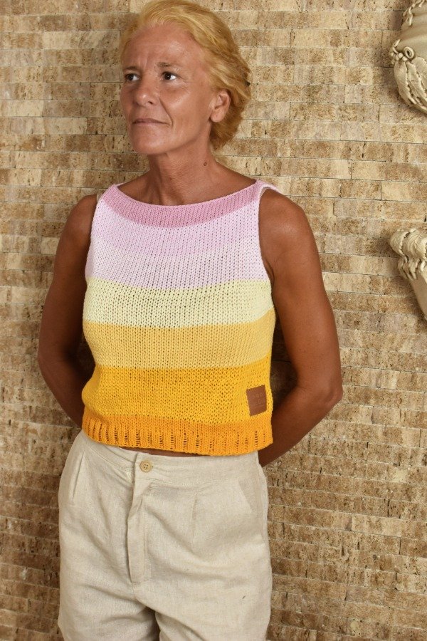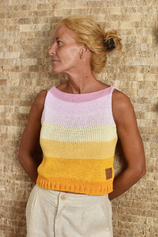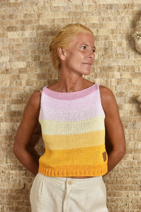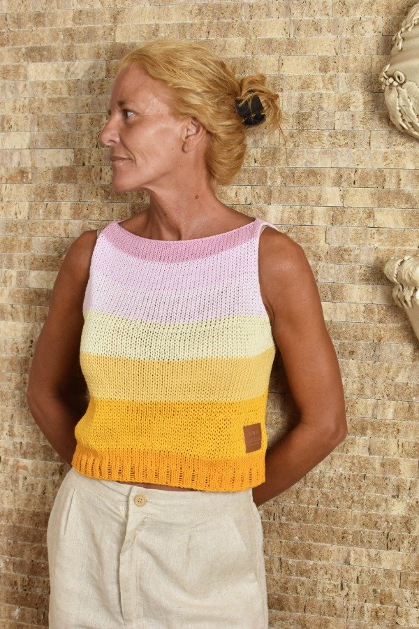Top tejido en hilo de algodón con unas vueltitas de elástico en cintura, tiene un calce super cómodo y queda muy hermoso puesto. Cada uno está hecho con combinaciones de color PRECIOSAS Y ÚNICA! (tratamos de no repetirlas nunca, pero algunas pueden ser parecidas nunca iguales) Las medidas en centímetros de la prenda colocada sobre una superficie plana son ancho o sisa a sisa 42 cm, alto de sisa 19/20 cm, largo total de la prenda 42 cm aprox. Podés comparar con alguna musculosa que te guste como te queda! La letra de talle es estimativa, una guía.