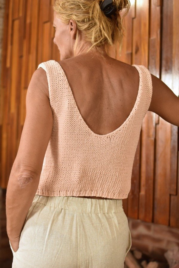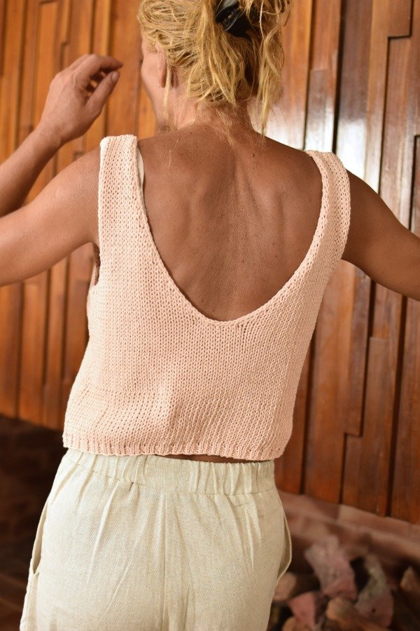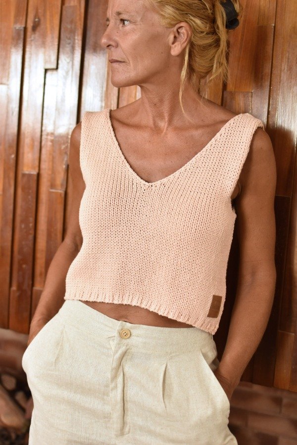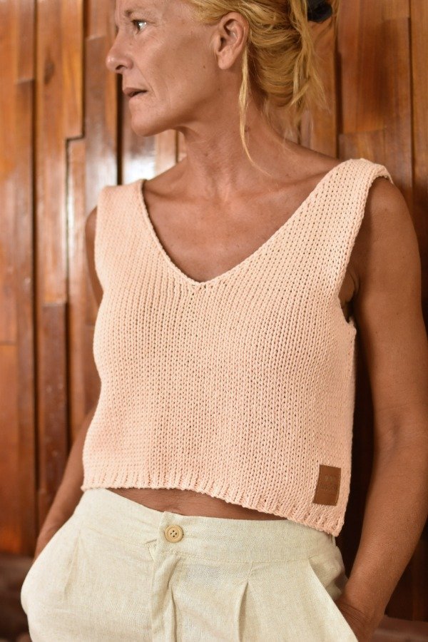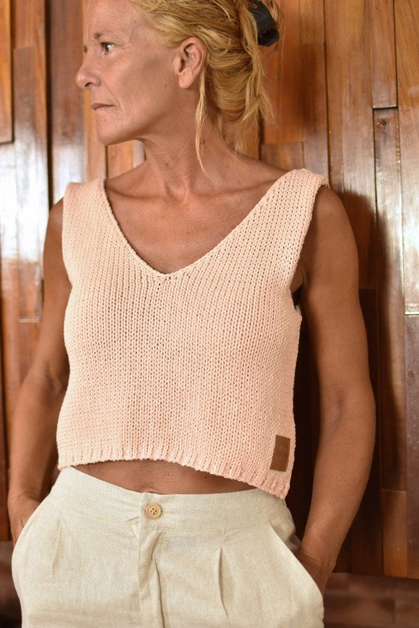 Es una prenda CORTITA pensada para usar con algún tiro alto, como en las fotos que la combinamos con nuestra bermuda sastrera de lino color crudo del más allá, es una bomba de conjunto!