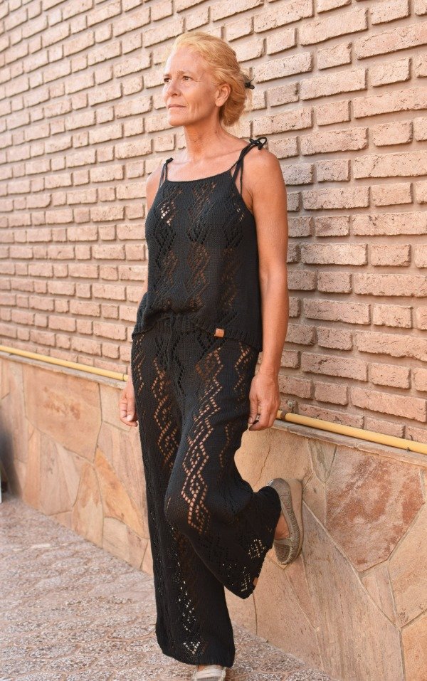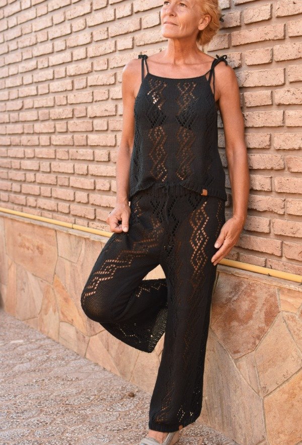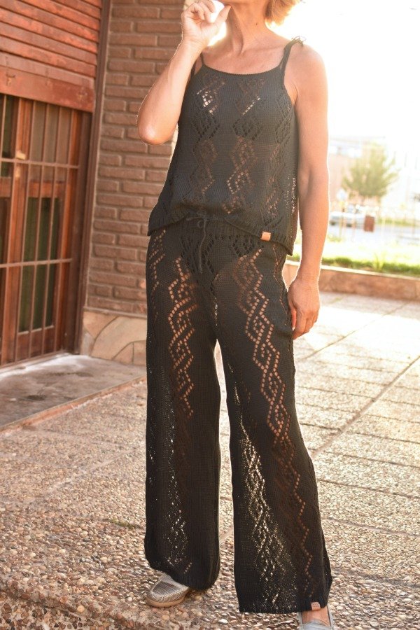 Este conjunto es realmente una fantasía! Palazzo del más allá y top calados, cada pieza hecha artesanalmente con hilo FINO de algodón, muy livianito y fresco. Es muy cómodo, es muy hermoso, es artesanal y es único! El dibujo del calado es realmente una obra de arte. Ni hablar que en negro NO puede fallar! Las medidas del top son ancho o sisa a sisa 45 cm, largo SIN CONTAR TIRAS 41 cm aprox. El top tiene tiras que se atan, permitiendo regular el largo de la prenda y también el escote. También tiene formita sueltita para más comodidad y frescura.