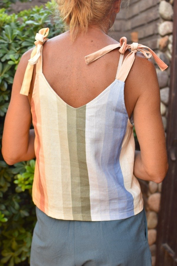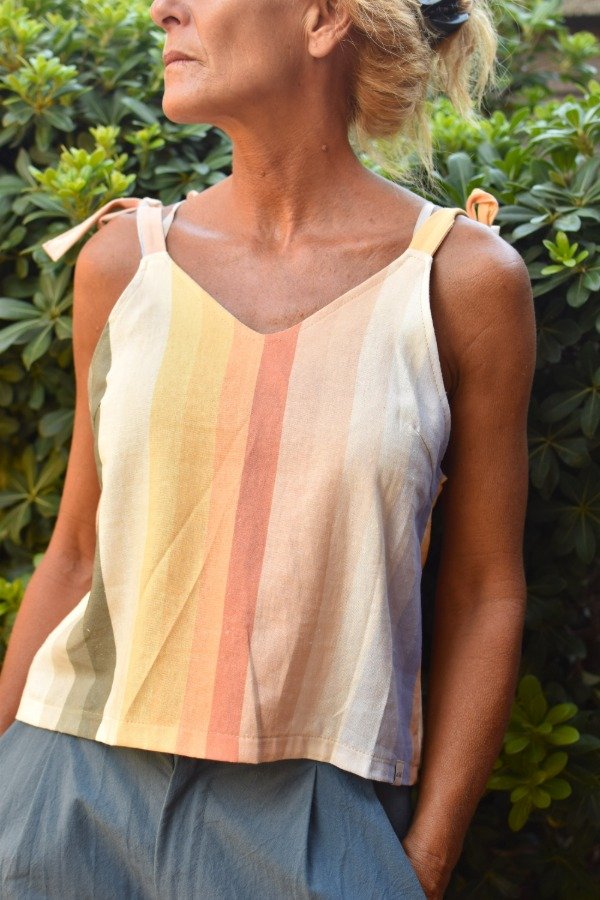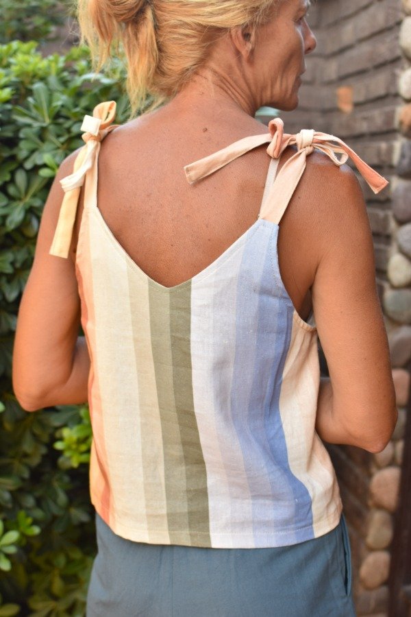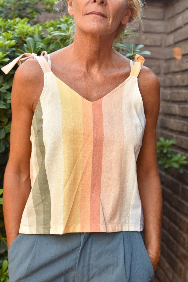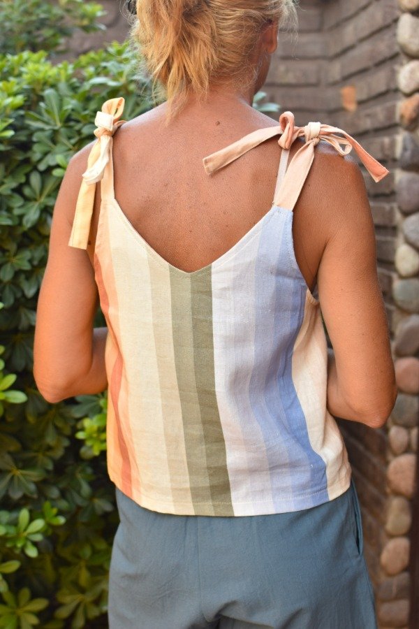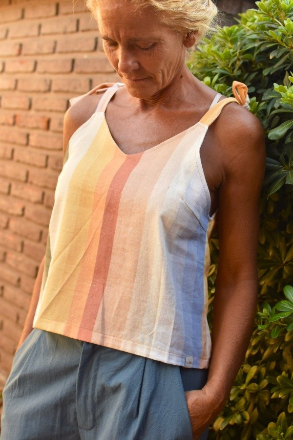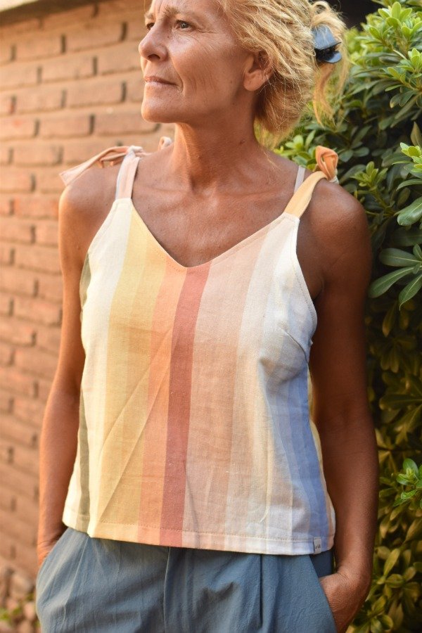 Felices de presentarles el nuevo miembro de la familia! Top de LINO con estampa EXCLUSIVA de Las Grilli, hecha por nosotras (ósea no la vas a encontrar en ningún otro lado, única). Obviamente no podía ser otro más qué un patrón rayado, pero con nuestros colores hermosisismos! Al ser una estampa no lineal, cada top sale distinto y eso nos encanta :) También como solemos hacer le hicimos tiras que se atan, osea que permite REGULAR largo y escote a gusto personal.