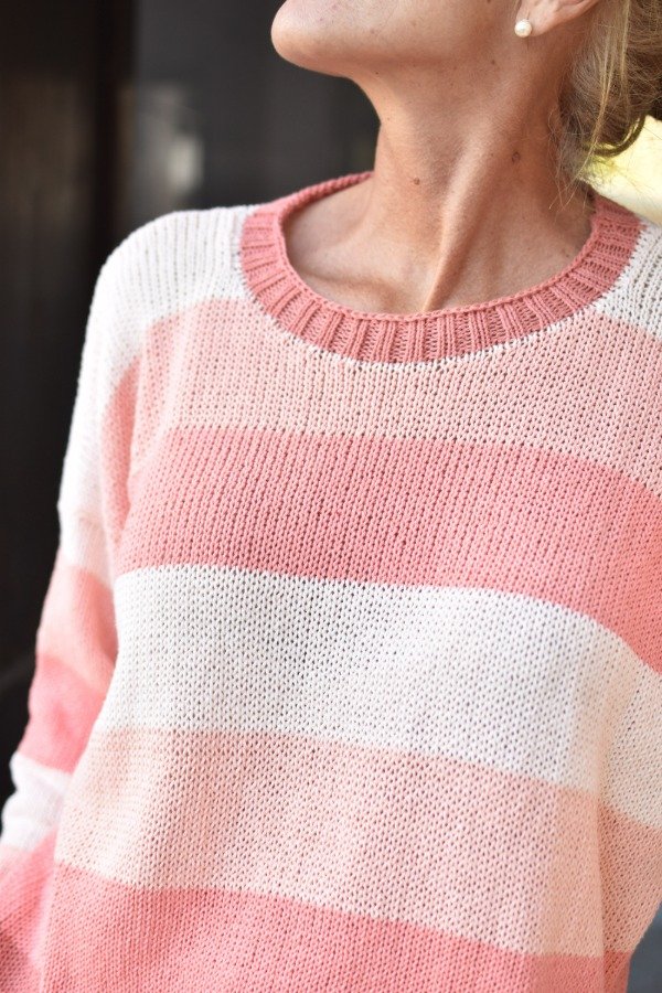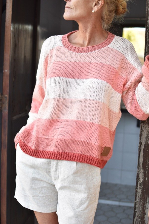 Sweater tejido con hilo fino de algodón super livianito y suave. Escote redondo, mangas rectas con elástico en puño y cintura. Sweater "clásico", con unos colores preciosos, liviano y muy cómodo! Las medidas en centímetros son sisa a sisa 59 cm, largo total 54 cm. Podés tomarle las medidas a un sweater que te guste como te queda y compararlas :) La letra de talle es estimativa, una guía.