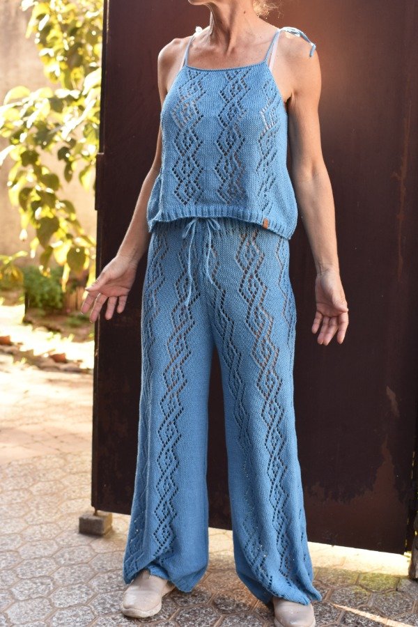 Este conjunto es realmente una fantasía! Palazzo del más allá y top calados, cada pieza hecha artesanalmente con hilo FINO de algodón, muy livianito y fresco. Es muy cómodo, es muy hermoso, es artesanal y es único! El dibujo del calado es realmente una obra de arte. Las medidas del top son ancho o sisa a sisa 46 cm, largo SIN CONTAR TIRAS 35.5 cm aprox. El top tiene tiras que se atan, permitiendo regular el largo de la prenda y también el escote. También tiene formita sueltita para más comodidad y frescura.