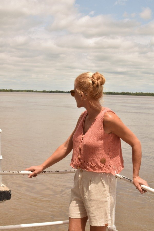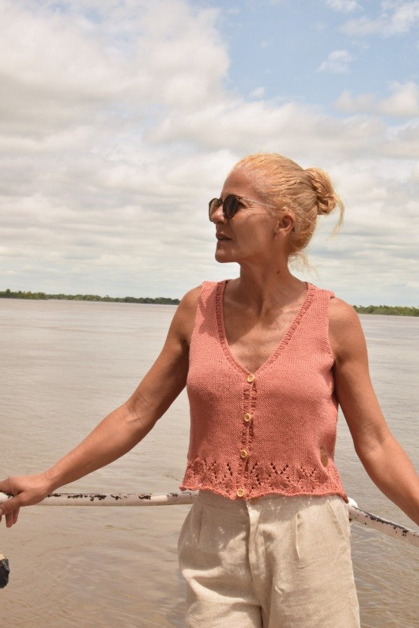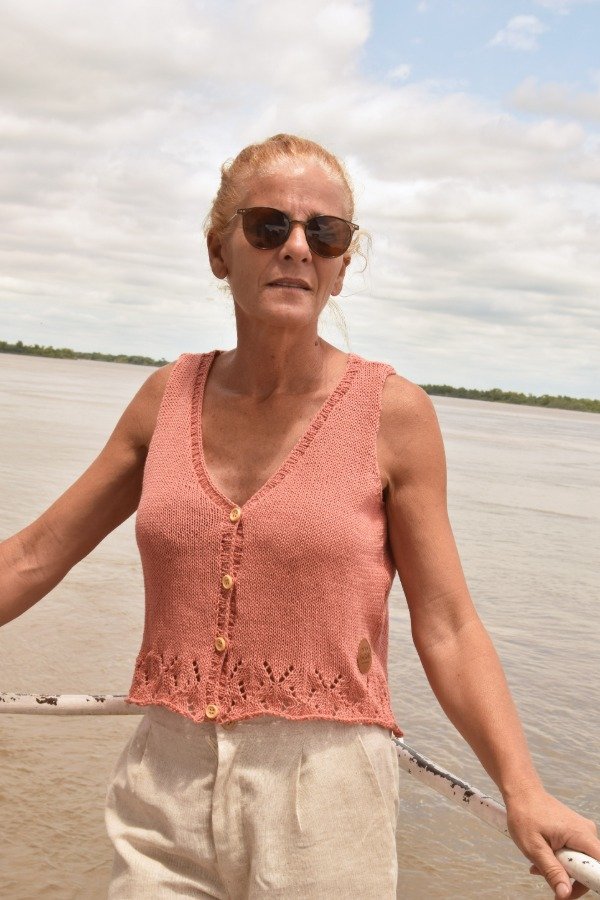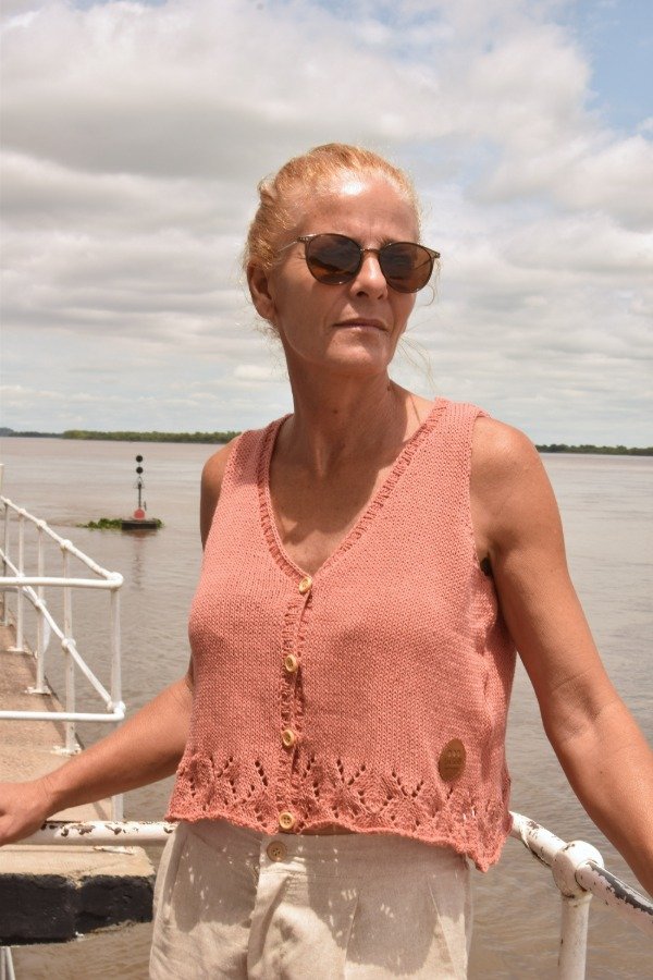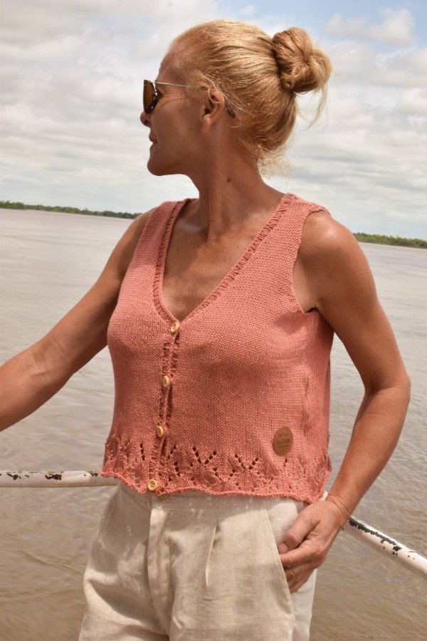 Chaleco tejido con HILO FINO de agodón, de lo más livianito, delicado y suave. Este chaleco está lleno de DETALLES que enamoran. En la parte de abajo tiene calados preciosos, también guarda con botoncitos de madera que le dan el toque. Es super fresco y también te VISTE para cualquier ocasión, es una HERMOSURA super ARTESANAL y ÚNICA! Las medidas en centímetros de la prenda cerrada y colocada sobre una superficie plana son ancho o sisa a sisa 48 cm, alto de sisa 20 cm, largo total de la prenda 46 cm aprox. Podés comparar con alguna musculosa/ reme o chalequito que te guste como te queda! La letra de talle es estimativa, una guía.