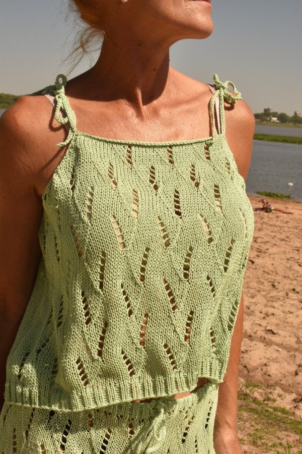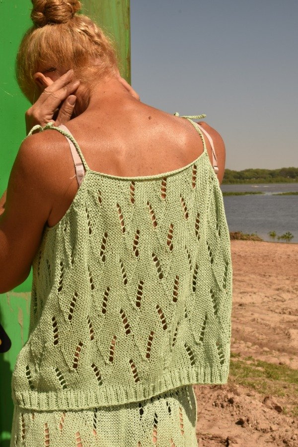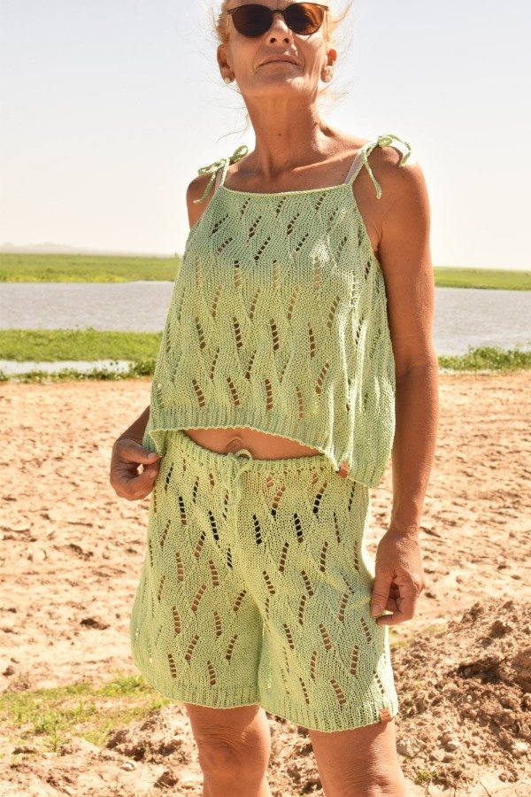 En este caso la modelo tiene el conjunto PERFECTO de musculosa calada + el shorsito calado, sin palabrasssss
