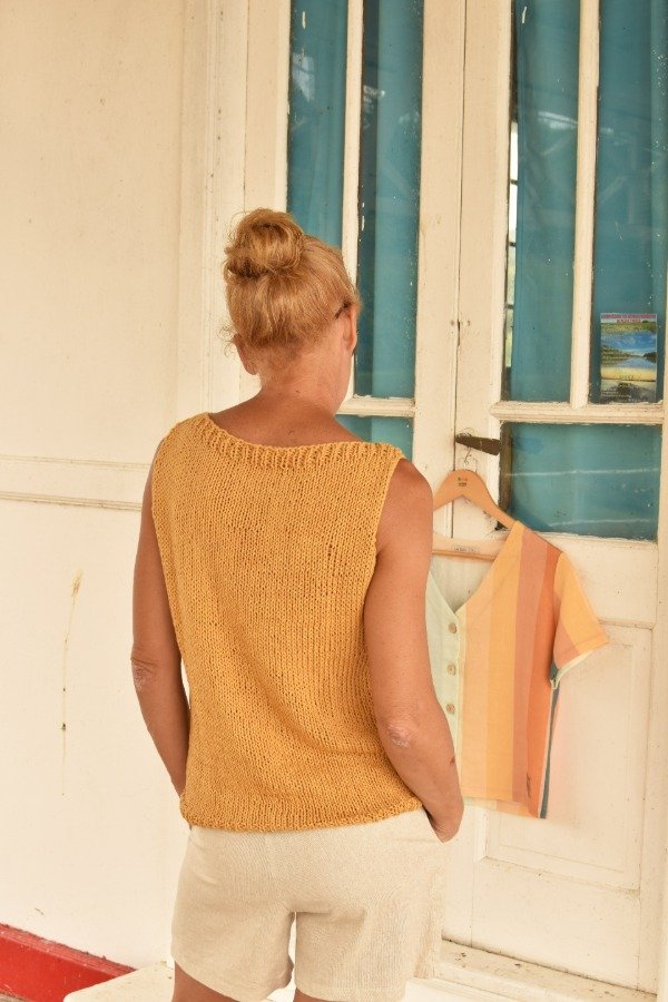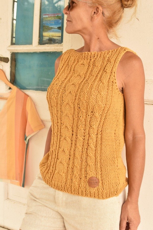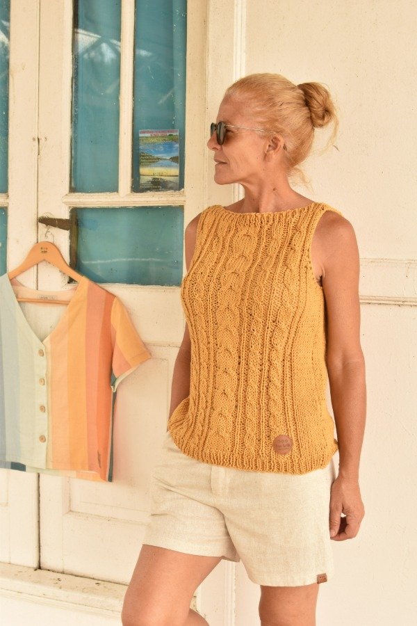 Musculosa teijda A MANO con hilo sedificado PREMIUN super suavecito y liviano. Diseño de trenzas precioso, adaptable y cómodo! Vamos cambiando el diseño todas las temporadas para NO repetir! El escote bote con algunas vueltas de elástico le da un toque sofisticado para cualquier ocasión. Es una musculosa que queda muy hermosa puesta, en este caso la combinamos con nuestra bermuda de LINO CRUDO y dio como resultado este conjunto BOMBA! Las medidas en centímetros son de sisa a sisa o ancho: 45 cm, como tiene punto de trenzas, se estira hasta 55 cm (90 a 110 contorno de busto), alto de sisa 21 cm, largo de la prenda: 60 cm. Podes tomarle las medidas una musculosa tuya que te guste como te queda y compararlas :) La letra de talle es estimativa, una guía.