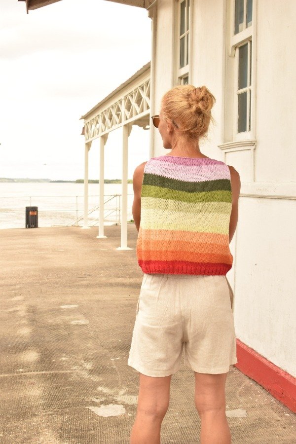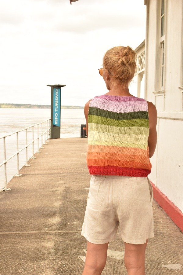Cada uno está hecho con combinaciones de color PRECIOSAS Y ÚNICAS! Las medidas en centímetros de la prenda colocada sobre una superficie plana son ancho o sisa a sisa 47 cm, largo de sisa 20 cm, largo total de la prenda 45 cm aprox. Podés comparar con alguna musculosa que te guste como te queda! La letra de talle es estimativa, una guía.