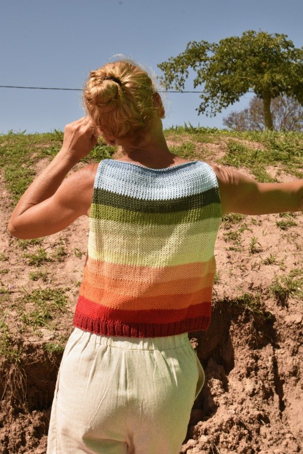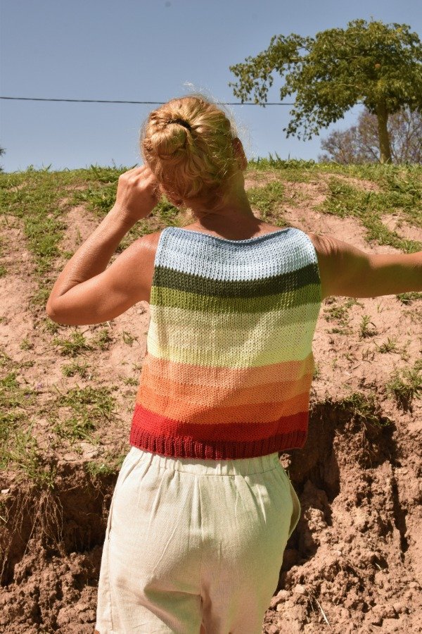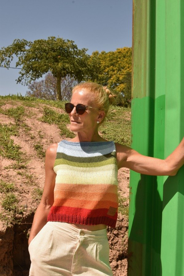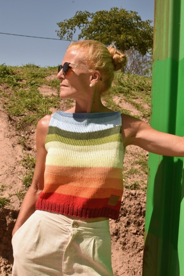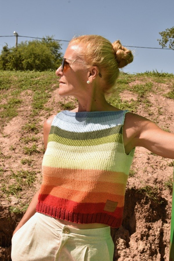 Cada uno está hecho con combinaciones de color PRECIOSAS Y ÚNICAS! Las medidas en centímetros de la prenda colocada sobre una superficie plana son ancho o sisa a sisa 44 cm, largo de sisa 20 cm, largo total de la prenda 44 cm aprox. Podés comparar con alguna musculosa que te guste como te queda! La letra de talle es estimativa, una guía.