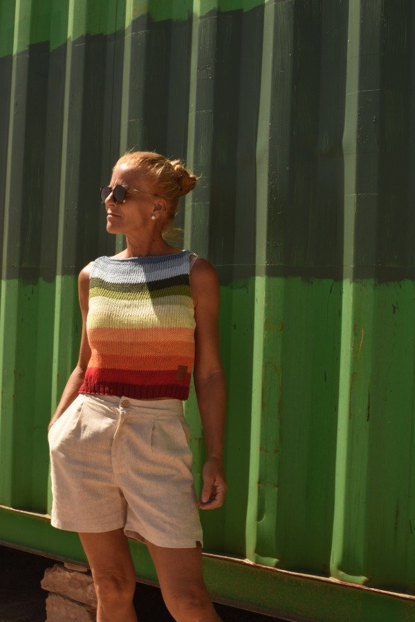 Es una prenda mas o menos CORTITA pensada para usar con algún tiro alto, como nuestras bermudas sastreras, en este caso lo combinamos con la de lino COLOR CRUDO y queda demasiado hermoso :)