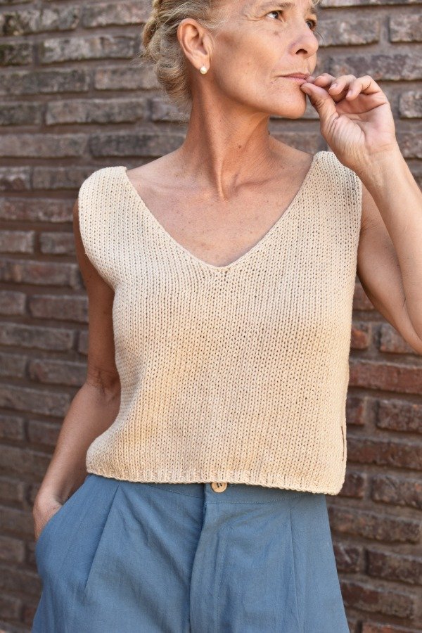 Top tejido en hilo de algodón, escote en V en delantera y escote un poquito más redondito y pronunciado en espalda que queda precioso! Tiene unas vueltitas de elástico en cintura. Un básico que no puede faltarte, con un color ESPECTACULAR!!! Las medidas en centímetros son sisa a sisa 47 cm, alto de sisa: 22 cm, largo total de la prenda 45 cm aprox. Podés comparar con las medidas de algún top/musculosa que te guste como te queda! La letra de talle es estimativa, una guía.