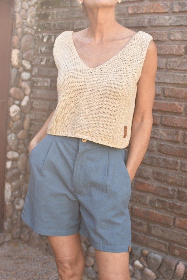 Es una prenda CORTITA pensada para usar con algún tiro alto, como en las fotos que la combinamos con nuestra bermuda sastrera azul aero del más allá, es una bomba de conjunto!