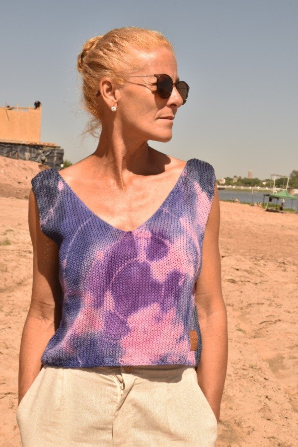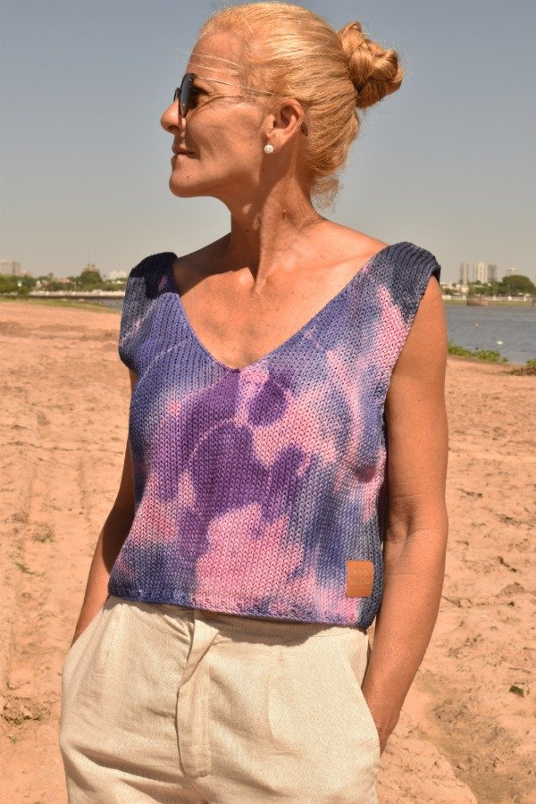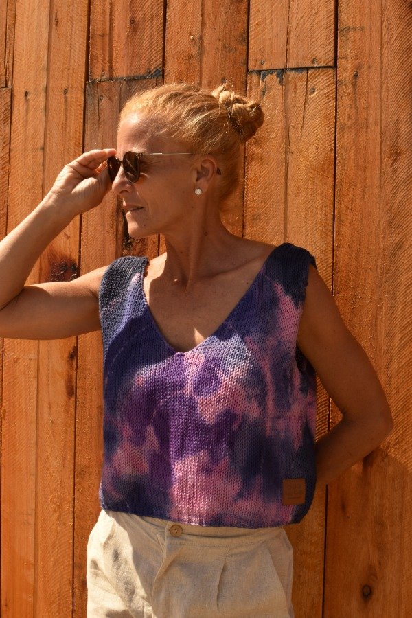 Top tejido en hilo de algodón, escote en V en delantera y escote un poquito más redondito y pronunciado en espalda que queda precioso! Tiene unas vueltitas de elástico en cintura. Un básico que no puede faltarte!!! Este top en particular fue teñido artesanalmente por nosotras, dando un resultado hermoso y ÚNICO, en tonos violetas y rosas! Las medidas en centímetros son sisa a sisa 50 cm, alto de sisa: 22 cm, largo total de la prenda 46 cm aprox. Podés comparar con las medidas de algún top/musculosa que te guste como te queda! La letra de talle es estimativa, una guía.