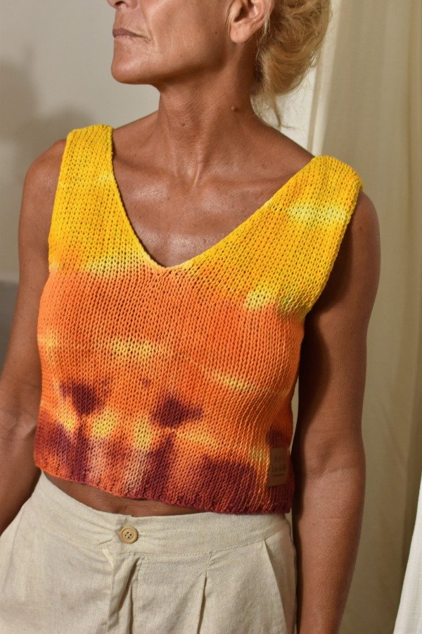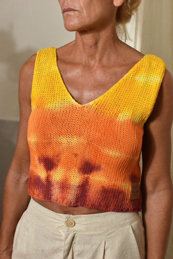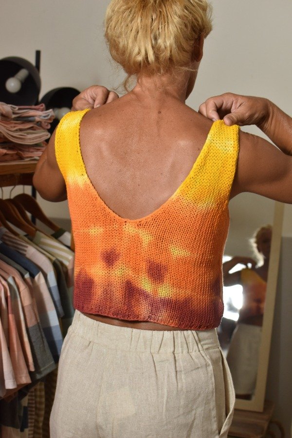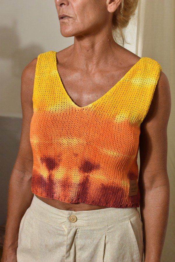 Top tejido en hilo de algodón, escote en V en delantera y escote un poquito más redondito y pronunciado en espalda que queda precioso! Tiene unas vueltitas de elástico en cintura. Un básico que no puede faltarte!!! Este top en particular fue teñido artesanalmente por nosotras, dando un resultado hermoso y ÚNICO, en un degradé de rojo, naranja y amarillo h e r m o s u r a única! Las medidas en centímetros son sisa a sisa 44 cm, alto de sisa: 20 cm, largo total de la prenda 42 cm aprox. Podés comparar con las medidas de algún top/musculosa que te guste como te queda! La letra de talle es estimativa, una guía.