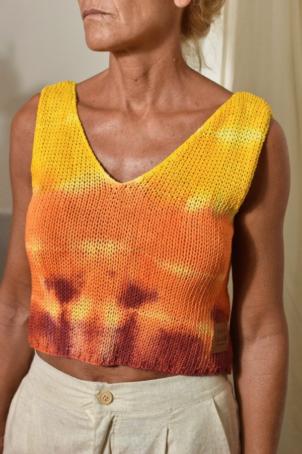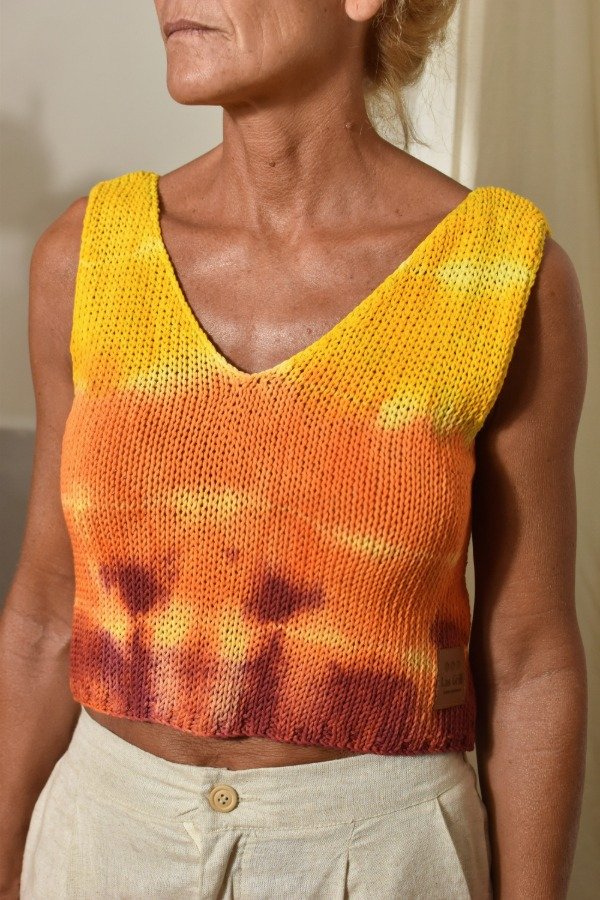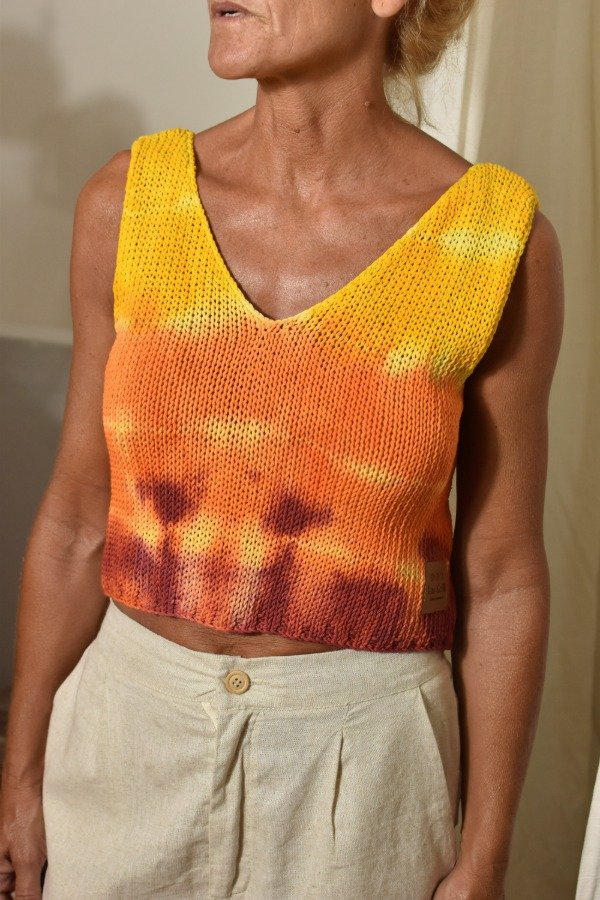 Al ser teñido artesanalmente, este top puede llegar a desteñir un poco (aunque previamente ya lavamos y sacamos excedente de tintura) por lo que recomendamos lavar sólo o con prendas de colores similares.
