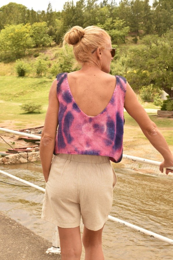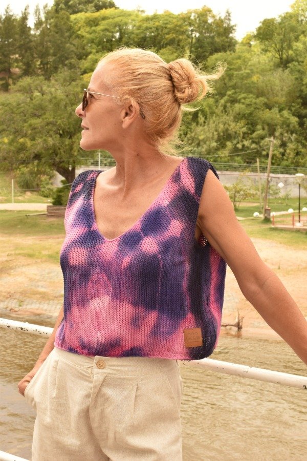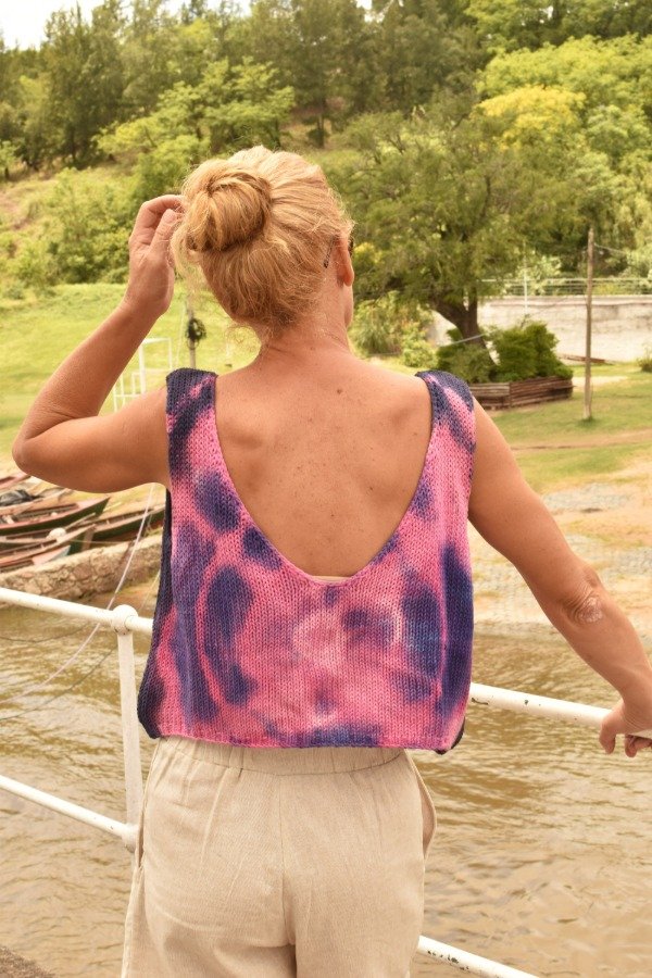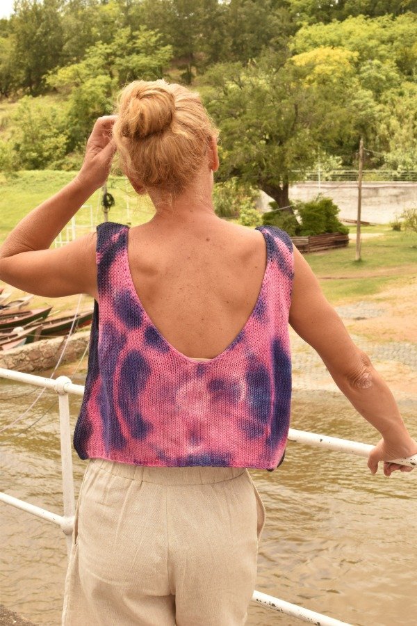Al ser teñido artesanalmente, este top puede llegar a desteñir un poco (aunque previamente ya lavamos y sacamos excedente de tintura) por lo que recomendamos lavar sólo o con prendas de colores similares.