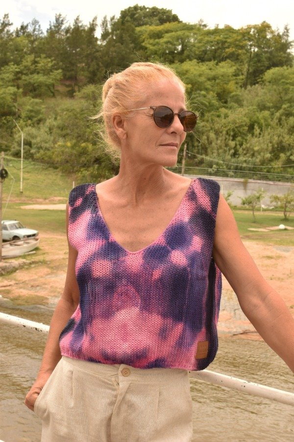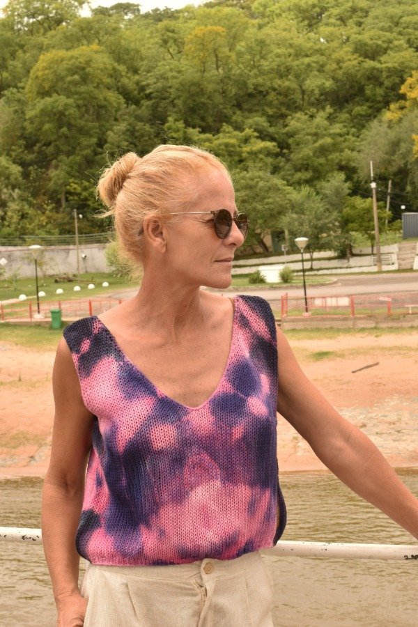 Top tejido en hilo de algodón, escote en V en delantera y escote un poquito más redondito y pronunciado en espalda que queda precioso! Tiene unas vueltitas de elástico en cintura. Un básico que no puede faltarte!!! Este top en particular fue teñido artesanalmente por nosotras, dando un resultado hermoso y ÚNICO, en tonos azules, violetas y rosas! Las medidas en centímetros son sisa a sisa 51 cm, alto de sisa: 22 cm, largo total de la prenda 45/46 cm aprox. Podés comparar con las medidas de algún top/musculosa que te guste como te queda! La letra de talle es estimativa, una guía.