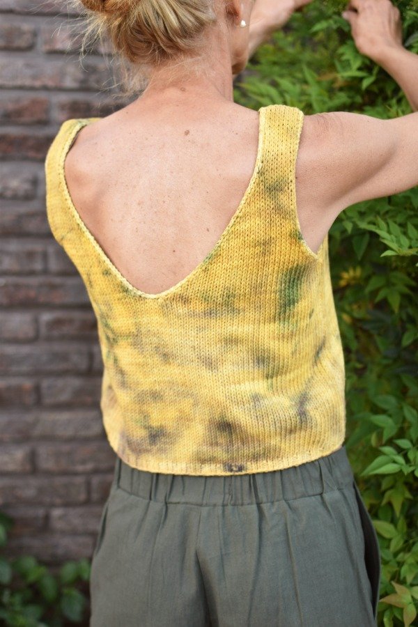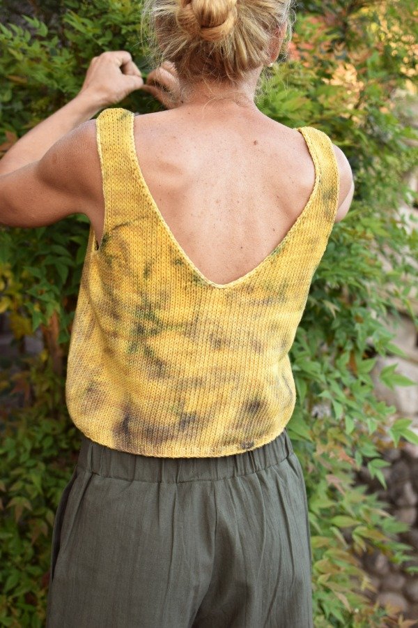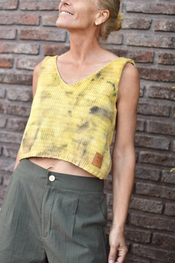 Top tejido en hilo de algodón, escote en V en delantera y escote un poquito más redondito y pronunciado en espalda que queda precioso! Tiene unas vueltitas de elástico en cintura. Un básico que no puede faltarte!!! Este top en particular fue teñido artesanalmente por nosotras, dando un resultado hermoso y ÚNICO, en tonos amarillos y verdes! Las medidas en centímetros son sisa a sisa 43 cm, alto de sisa: 21 cm, largo total de la prenda 45 cm aprox. Podés comparar con las medidas de algún top/musculosa que te guste como te queda! La letra de talle es estimativa, una guía.