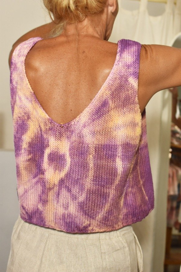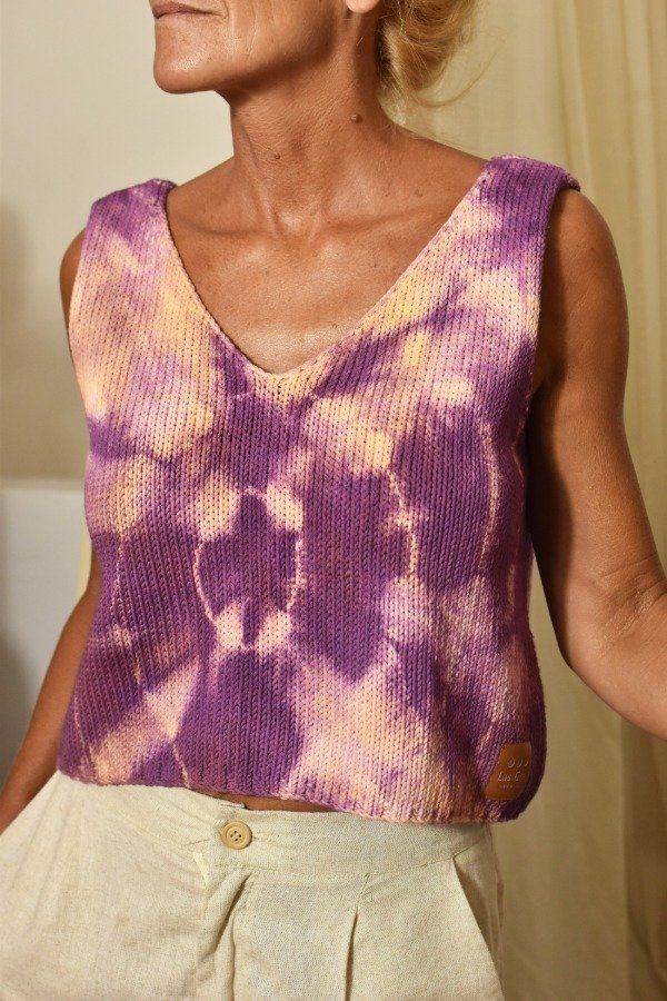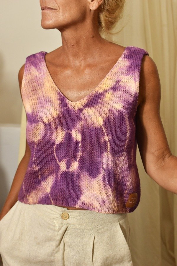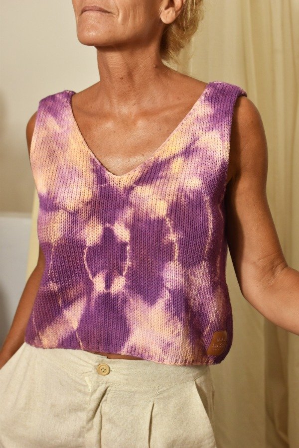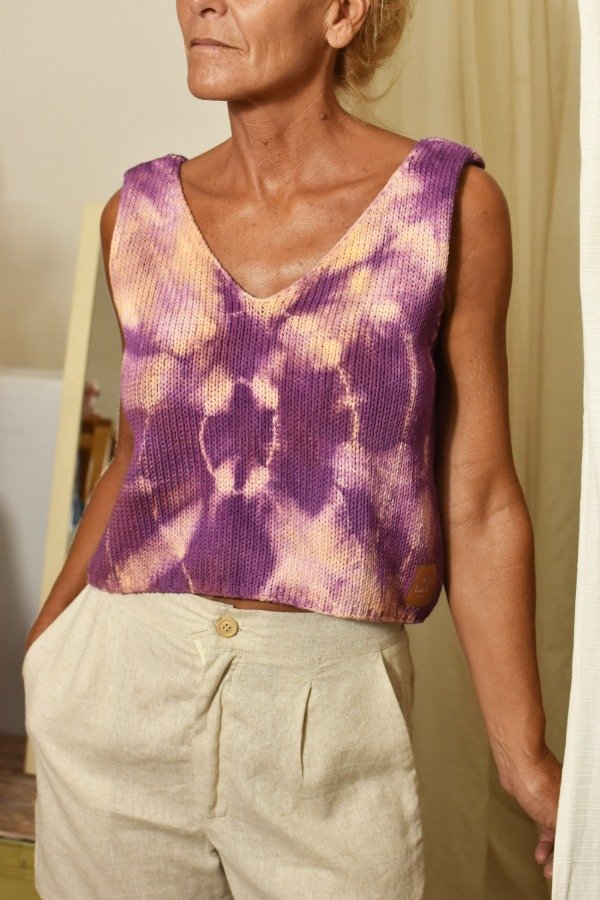 Al ser teñido artesanalmente, este top puede llegar a desteñir un poco (aunque previamente ya lavamos y sacamos excedente de tintura) por lo que recomendamos lavar sólo o con prendas de colores similares.