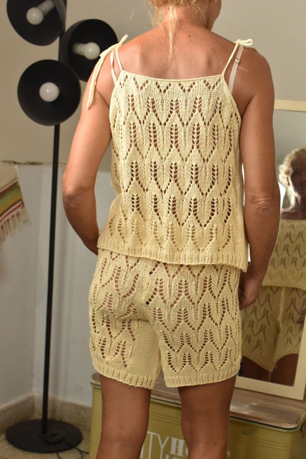 Este conjunto es realmente una fantasía! Short y top calados, cada pieza hecha artesanalmente con hilo FINO de algodón, muy livianito y fresco. Es muy cómodo, es muy hermoso, es artesanal y es único! Las medidas del top son ancho o sisa a sisa 47/48 cm, largo SIN CONTAR TIRAS 37/38 cm aprox. El top tiene tiras que se atan, permitiendo regular el largo de la prenda y también el escote. También tiene formita sueltita para más comodidad y frescura.