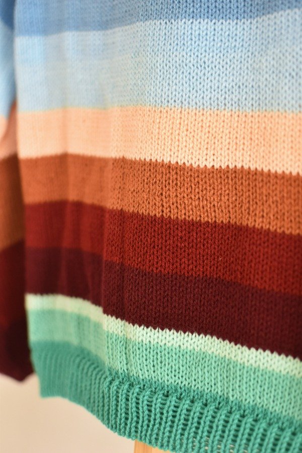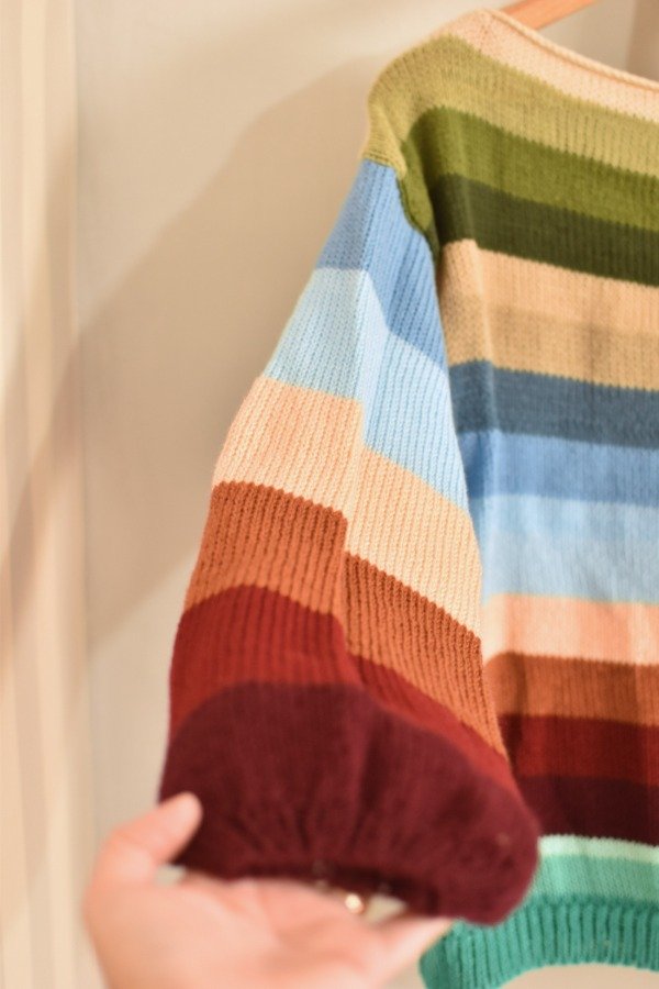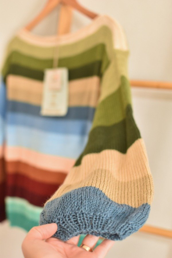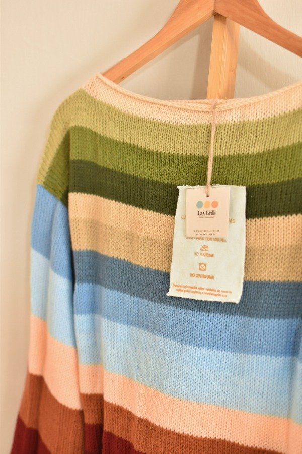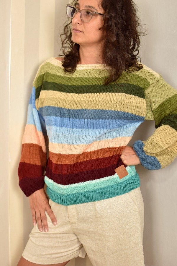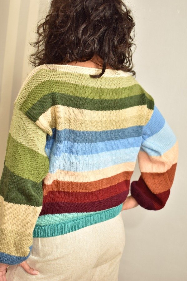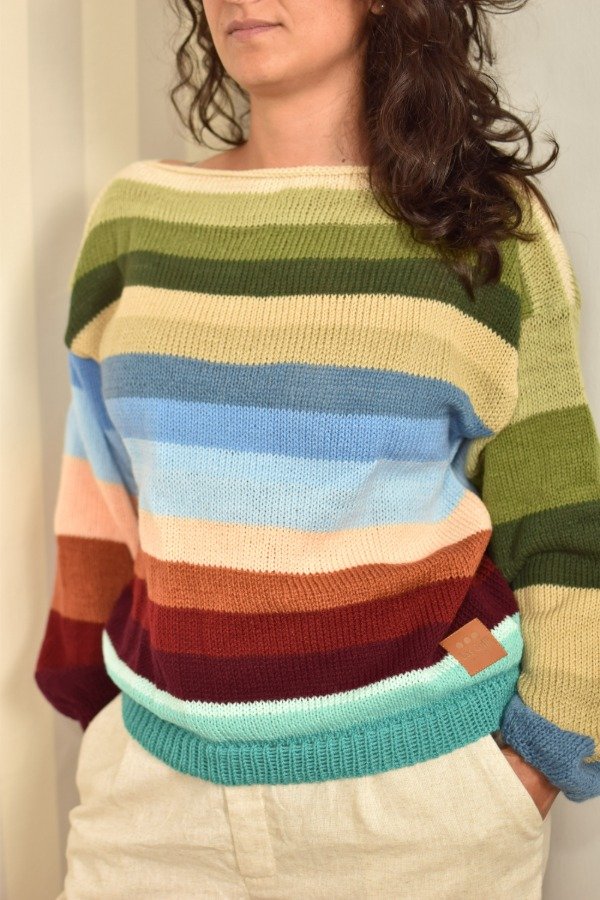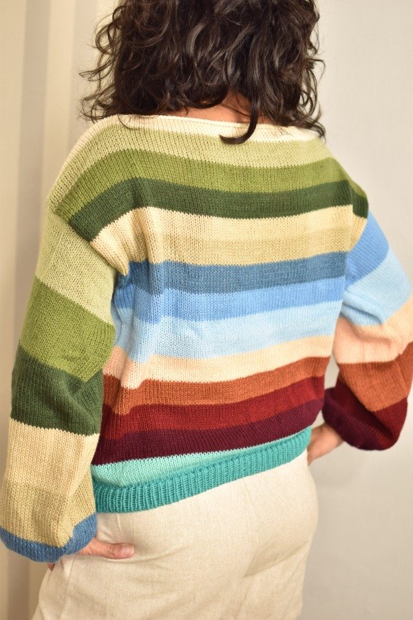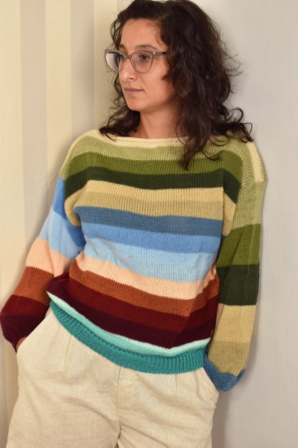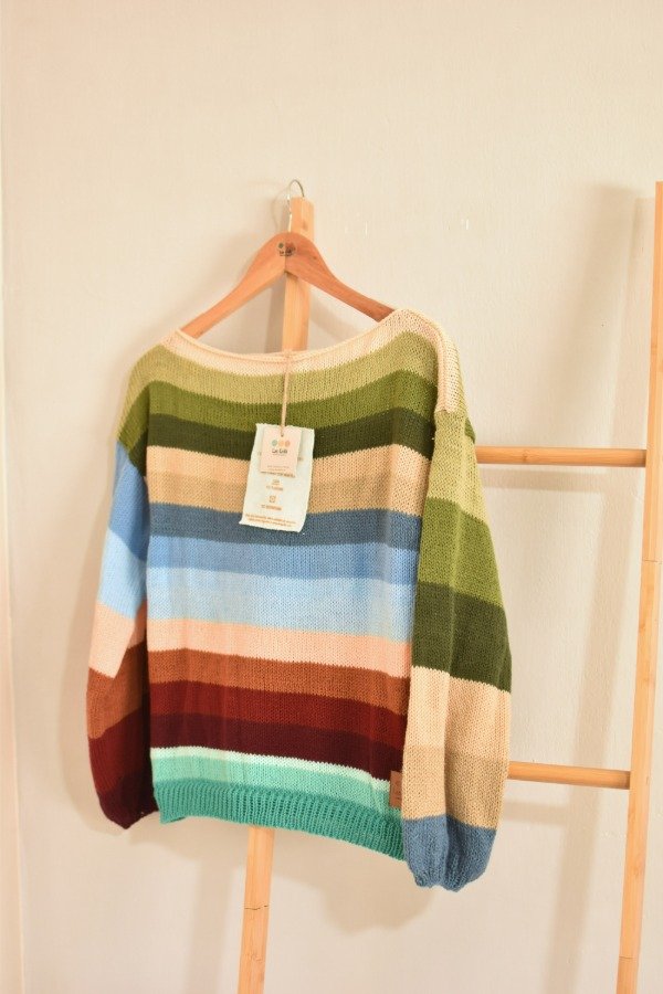 Sweater tejido con lana fina muy suavecita, tiene escote bote, mangas globo y unas vueltitas de punto elástico en puño y cintura. Es uno de nuestros favoritos porque lo tejemos con ovillitos sobrantes de lana, dando como resultado una prenda totalmente ÚNICA! El diseño de color de mangas es distintos entre sí! Las medidas en centímetros son sisa a sisa 54 cm, largo total de la prenda 54 cm aprox. Podes tomarle las medidas a un sweater que te guste como te queda y compararlas :) La letra de talle es estimativa, una guía.