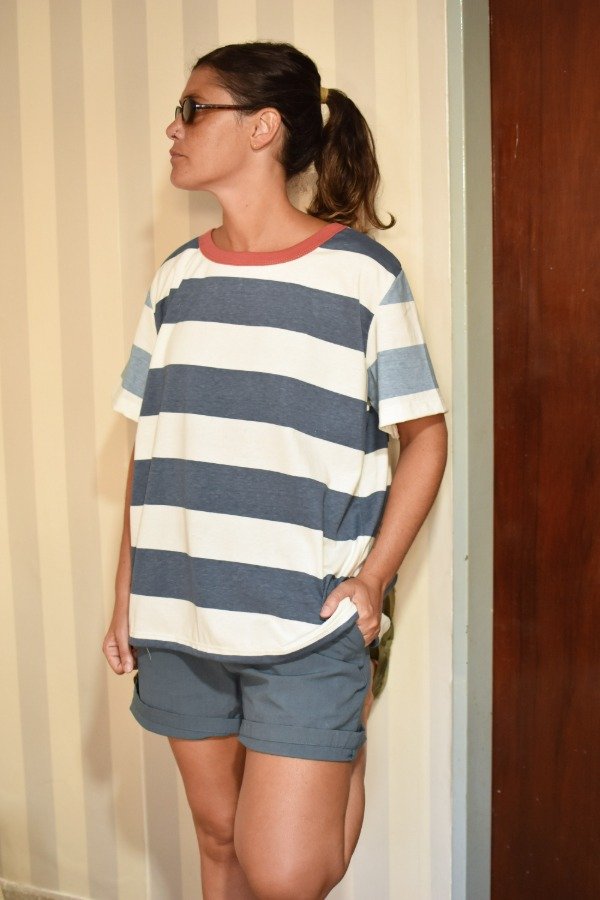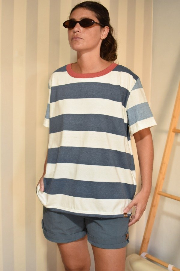 La modelo tiene en conjunto con la remera zero waste nuestra BERMUDA sastrera de algodón AZUL AERO.