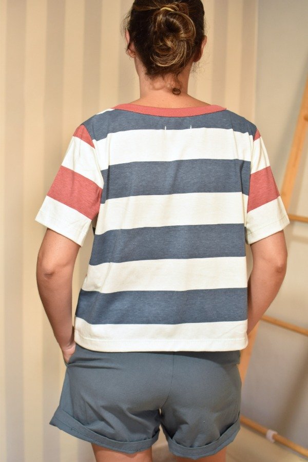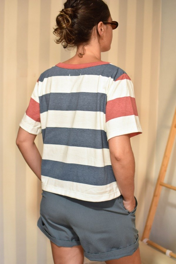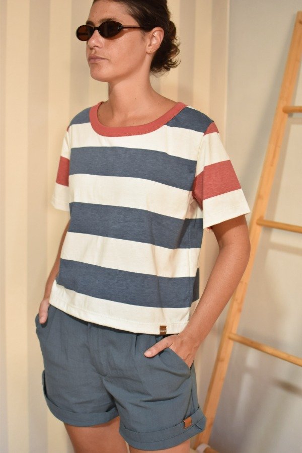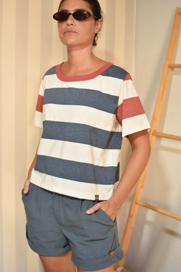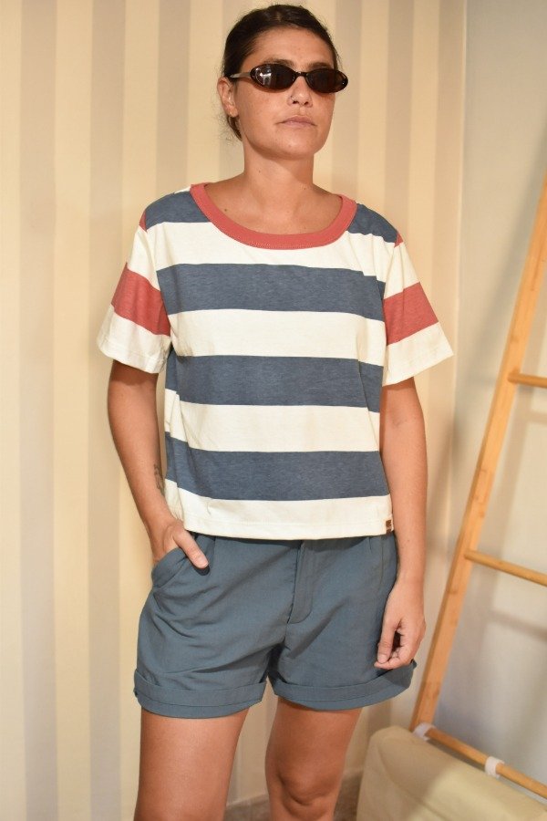 La modelo tiene en conjunto con la remera zero waste nuestra BERMUDA sastrera de algodón AZUL AERO.