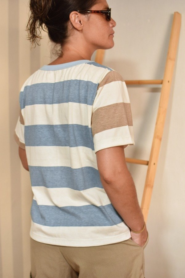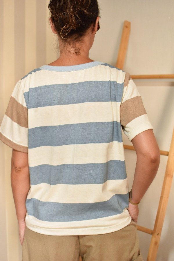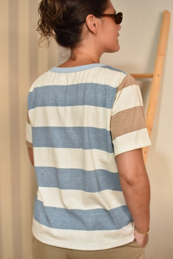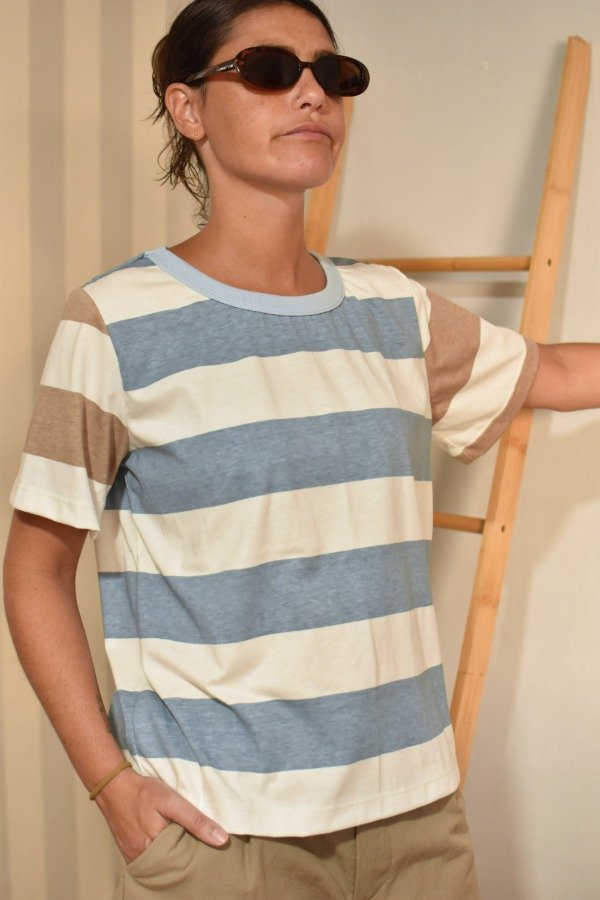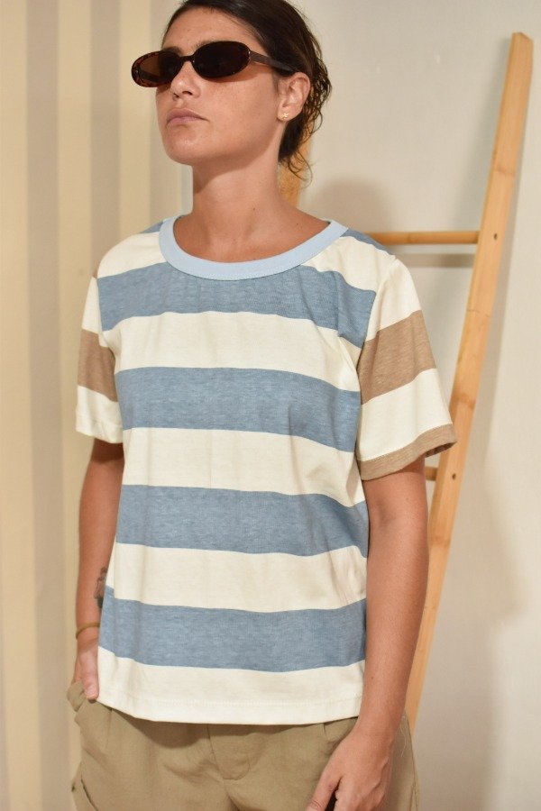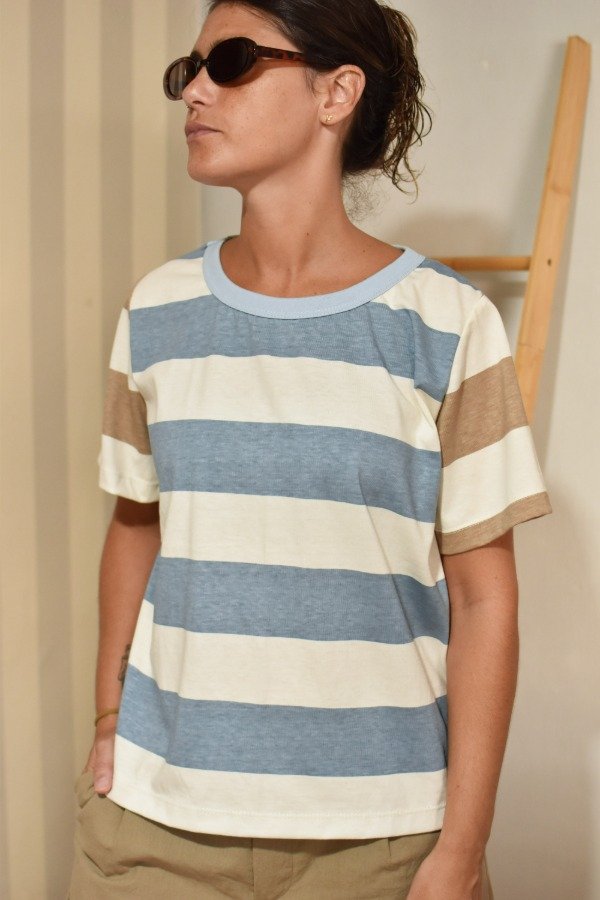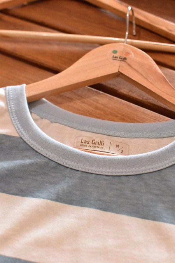 Remeras de algodón 100%, en esta ocasión combinamos colores del mismo textil rayado dando como resultado una NUEVA REMERA distinta y ORIGINAL, que es a lo que apuntamos cuando diseñamos nuestras prendas.