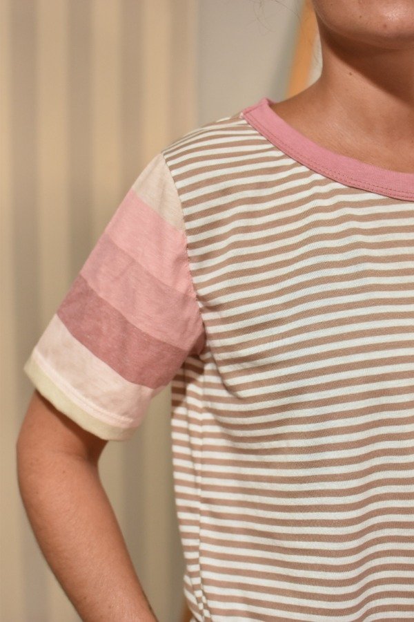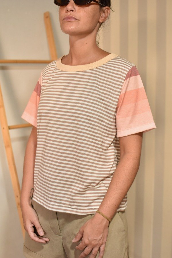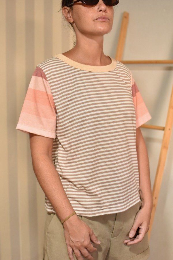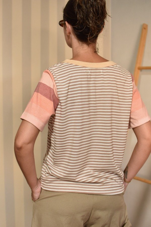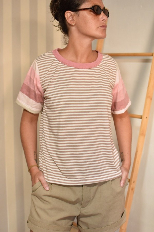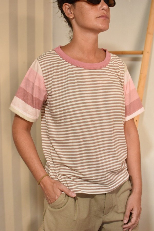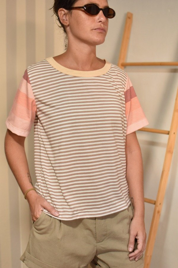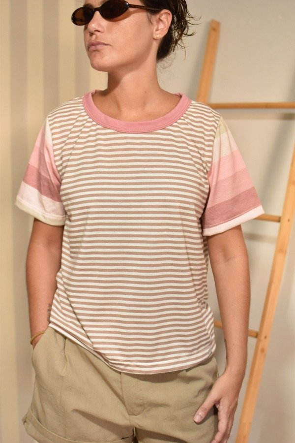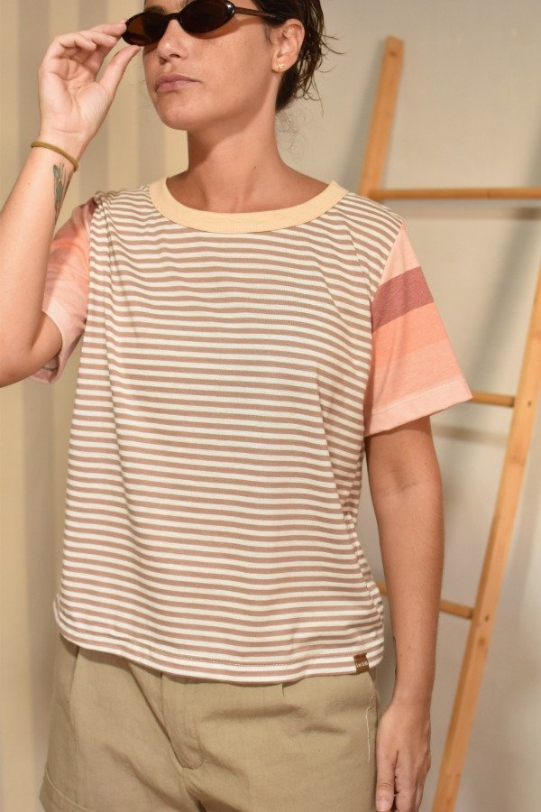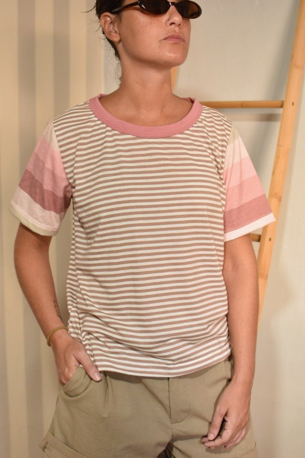 Remeras 100% algodón, hechas a partir de los sobrantes de nuestras estampas propias, donde tratando de reutilizar el mayor material posible, sacamos de los residuos mangas que mezclamos con textiles rayados más "clásicos" para crear una NUEVA REMERA totalmente distinta, ÚNICA E IRREPETIBLE!