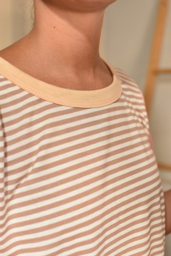 La modelo tiene en conjunto con la remera zero waste nuestra BERMUDA sastrera algodón color BEIGE.