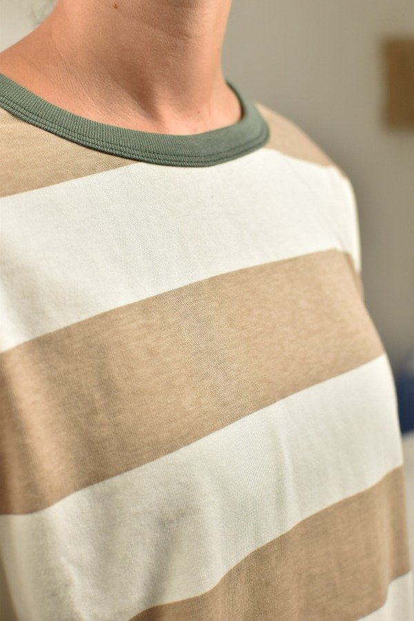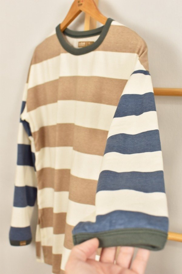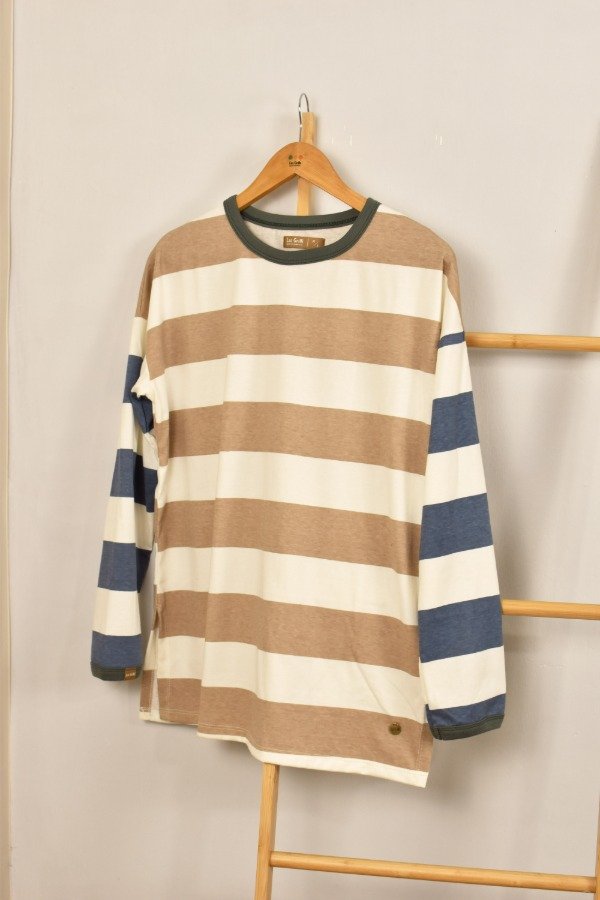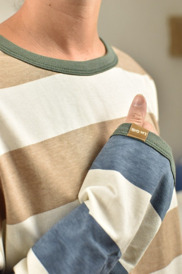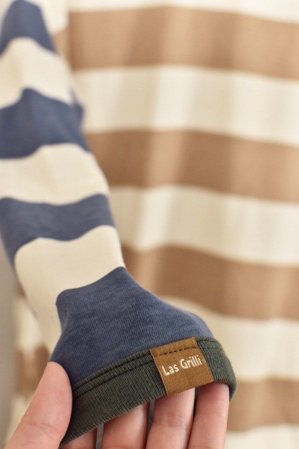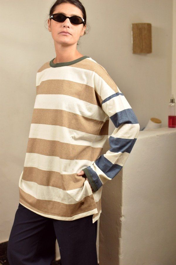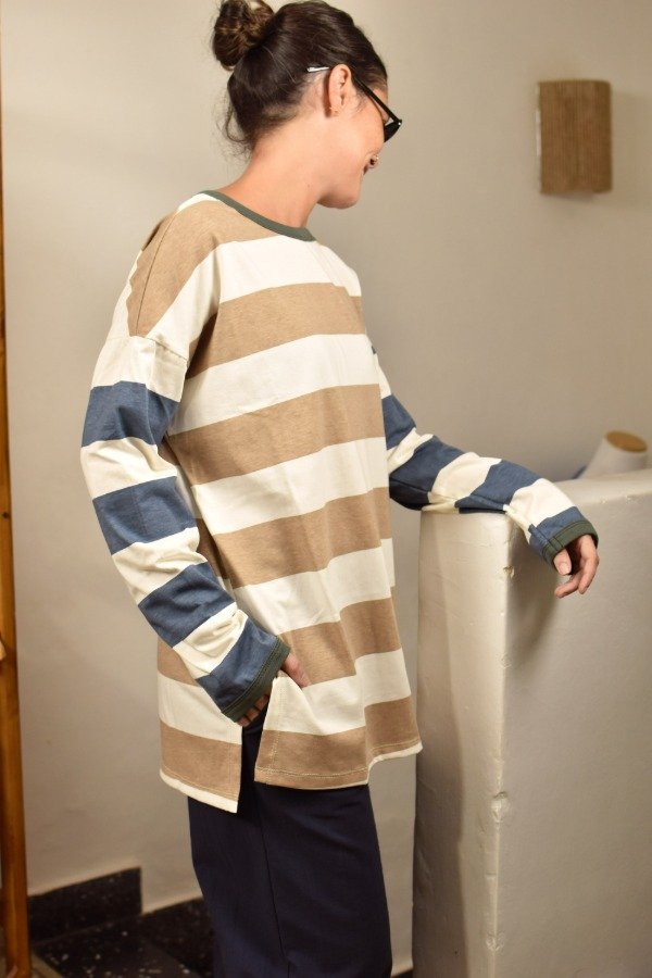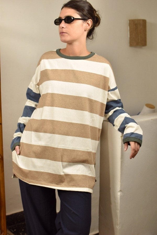 Remerón mangas largas, cien por ciento algodón super super suave. Escote redondo, mangas caídas. Tajos laterales que hacen a la prenda muy cómoda y de calce más holgado y descontracturado qué a m a m o s. Esta tela es un espectáculo, gruesita y con cuerpo. Para darle nuestro toque a este rayado bastón combinamos beige + azul, hicimos cuellitos en distintos colores de ribb y también un detalle de envivado en los puños que terminan de hacer esta prenda especial y única.