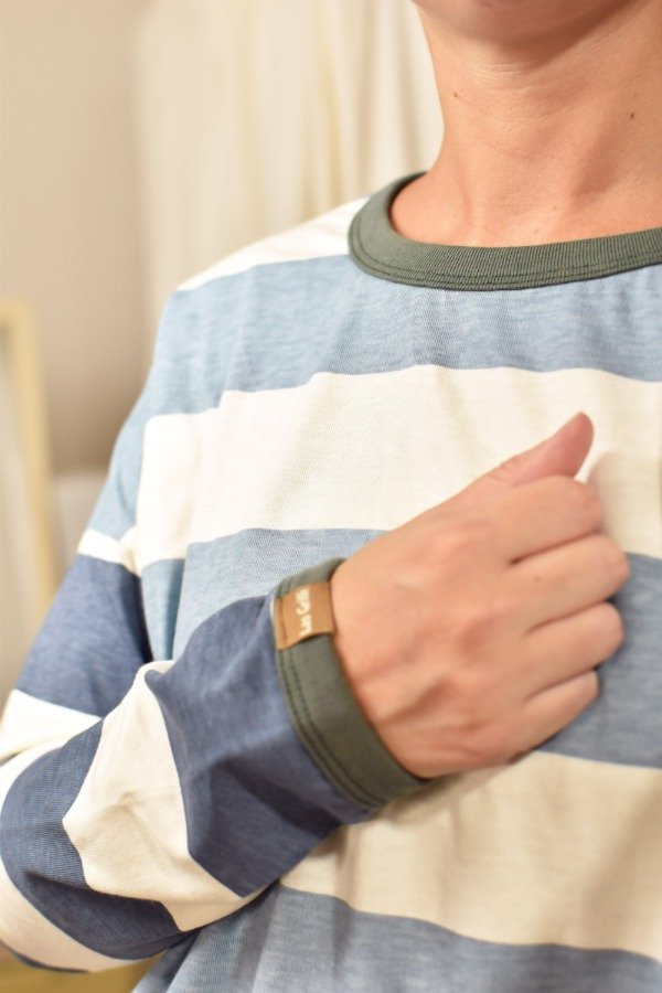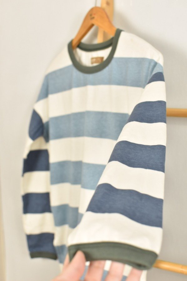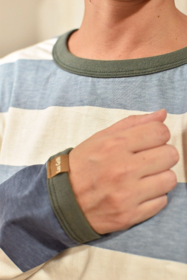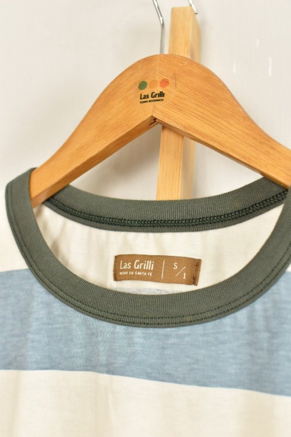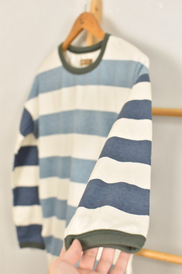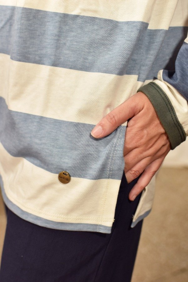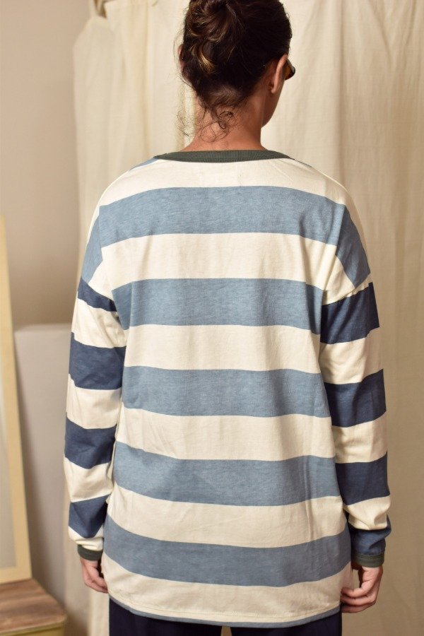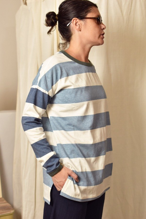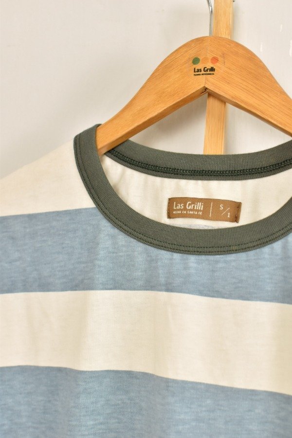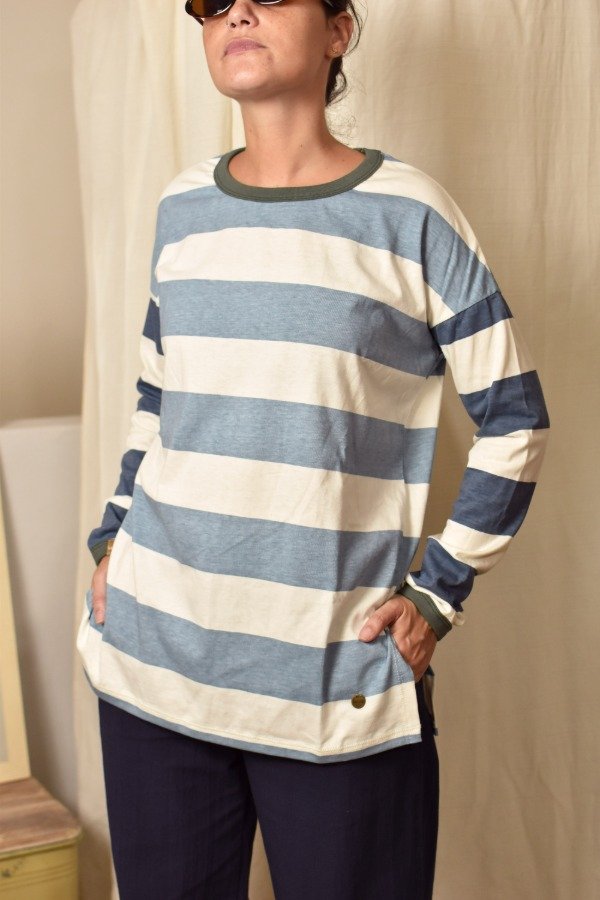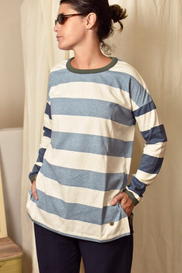 Remerón mangas largas, cien por ciento algodón super super suave. Escote redondo, mangas caídas. Tajos laterales que hacen a la prenda muy cómoda y de calce más holgado y descontracturado qué a m a m o s. Esta tela es un espectáculo, gruesita y con cuerpo. Para darle nuestro toque a este rayado bastón combinamos celeste + azul, hicimos cuellitos en distintos colores de ribb y también un detalle de envivado en los puños que terminan de hacer esta prenda especial y única.