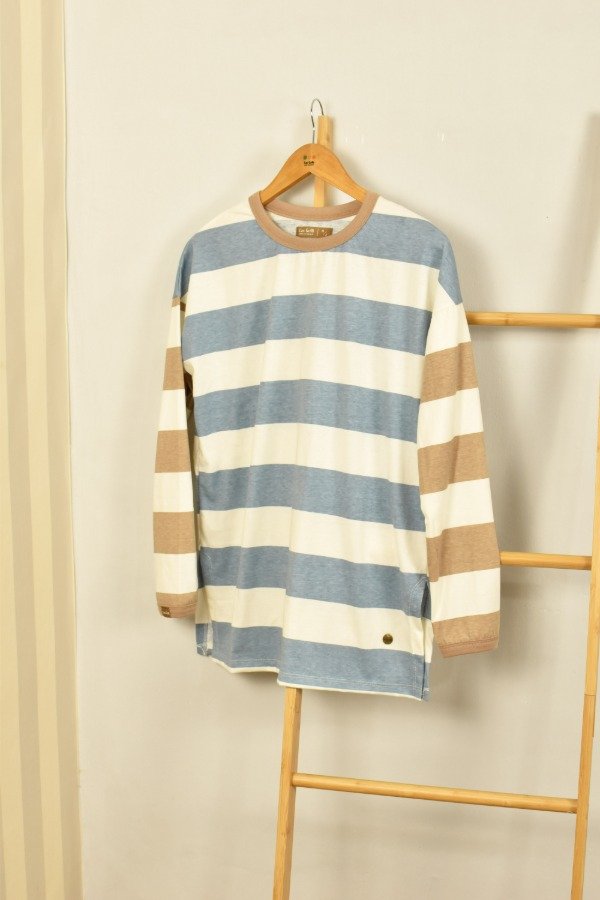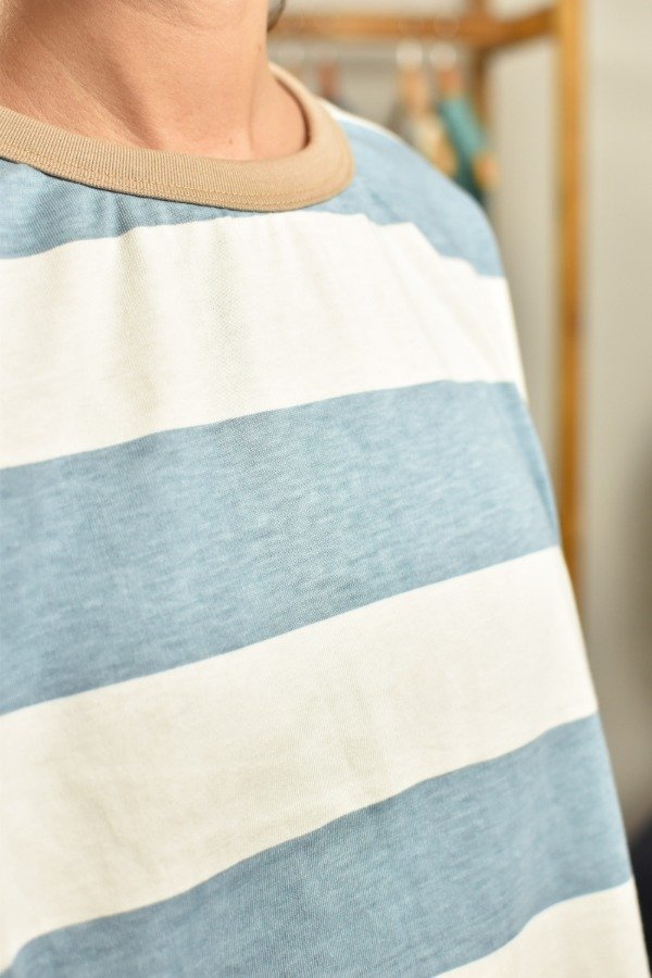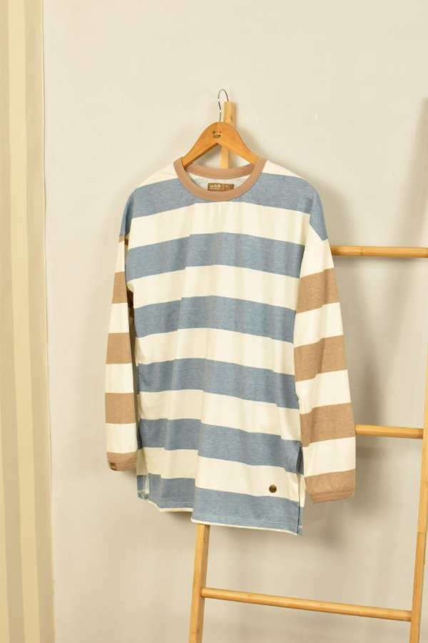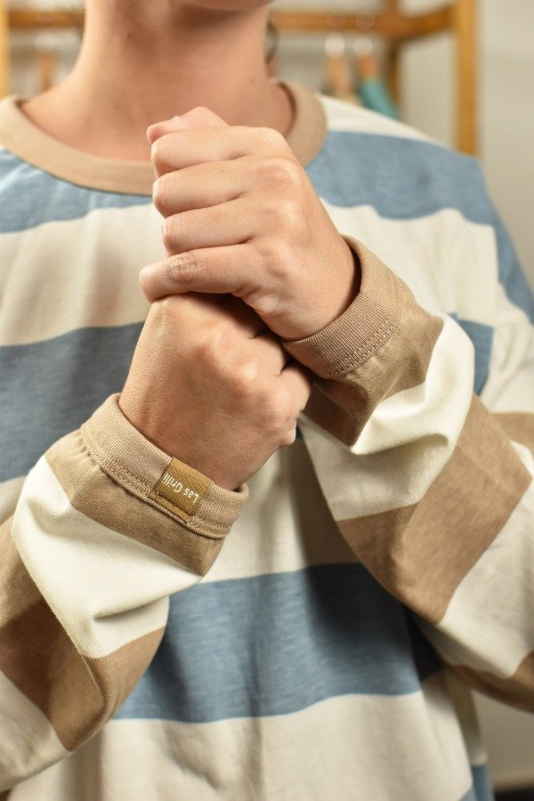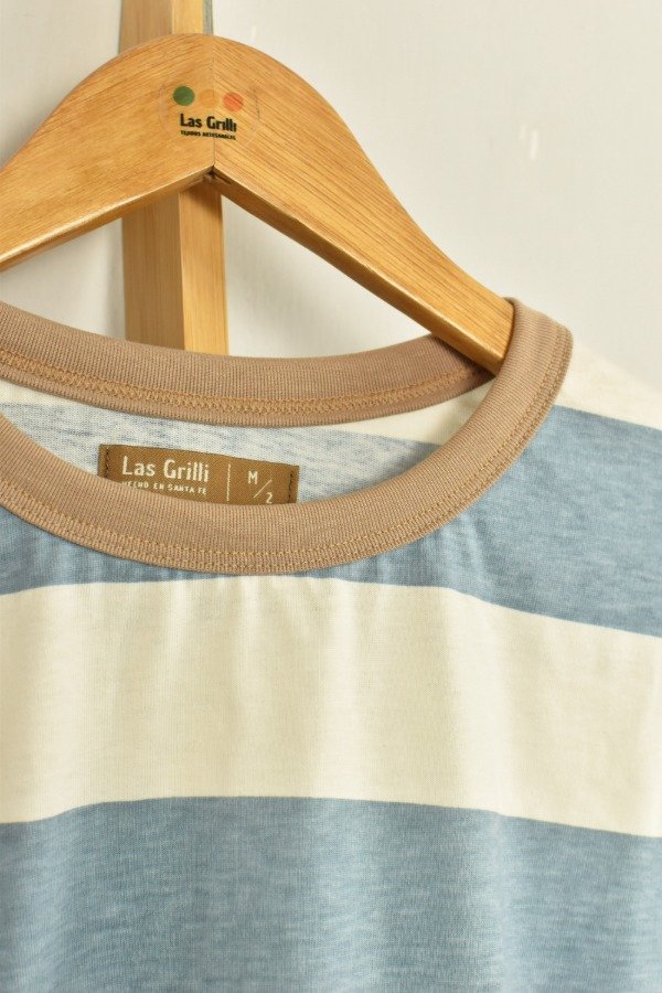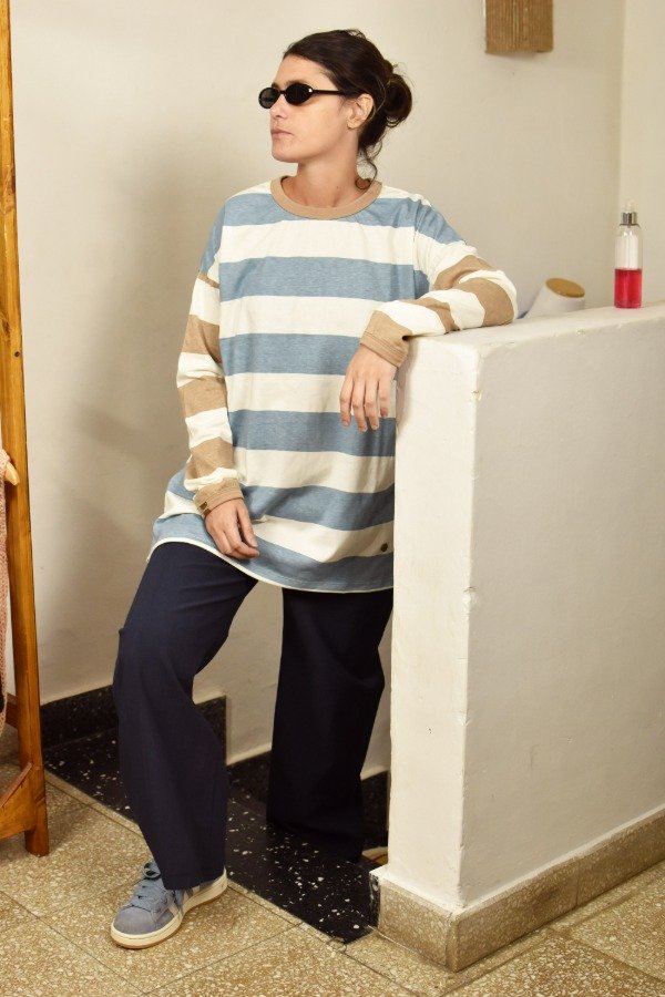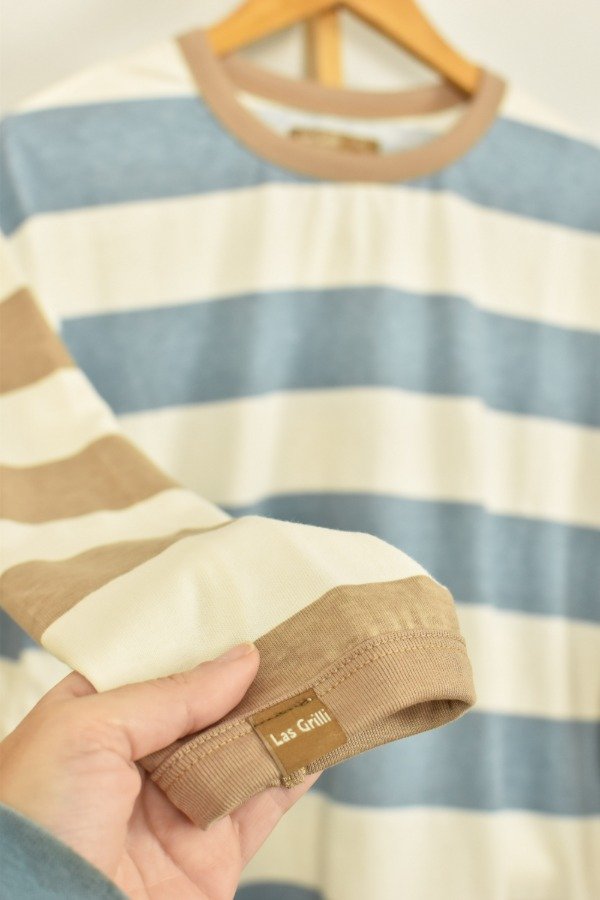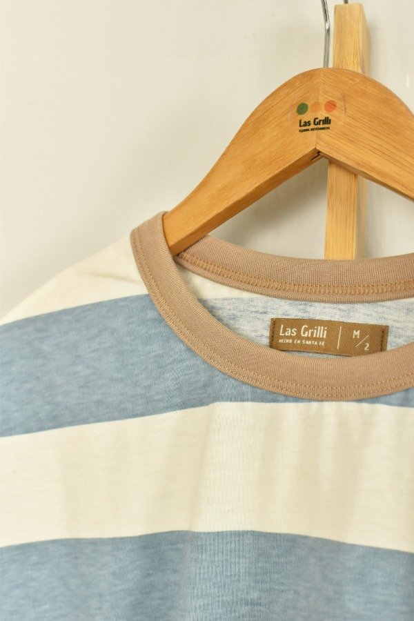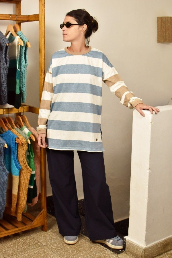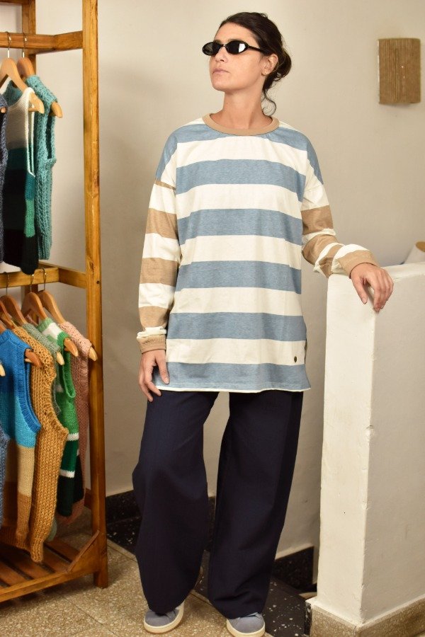 Remerón mangas largas, cien por ciento algodón super super suave. Escote redondo, mangas caídas. Tajos laterales que hacen a la prenda muy cómoda y de calce más holgado y descontracturado qué a m a m o s. Esta tela es un espectáculo, gruesita y con cuerpo. Para darle nuestro toque a este rayado bastón combinamos celeste + beige, hicimos cuellitos en distintos colores de ribb y también un detalle de envivado en los puños que terminan de hacer esta prenda especial y única.