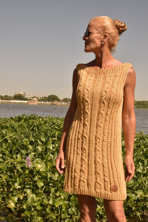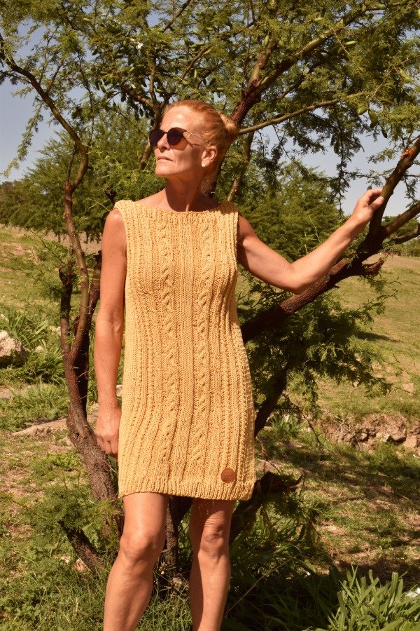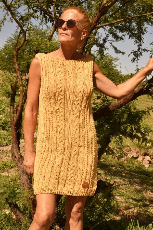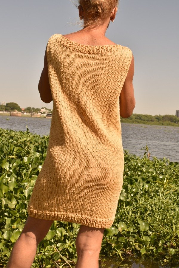 Vestido tejido A MANO, en hilo de algodón. Tiene escote bote con detalle de elástico que queda divino y le da amplitud. Punto de trenzas super fino que vamos cambiando para que nunca sean iguales. La espalda está tejida con punto jersey para que el diseño no quede tan cargado y además le da más soltura a la prenda. Es increíble la versatilidad de esta pieza, se puede usar de día, pero también de noche! Es una prenda increíble, hecha a mano, muy muy delicada. Las medidas en centímetros tomadas sobre una superficie plana son: ancho 48 cm como el vestido tiene punto de trenzas que es bien elástico, se estira hasta 58 cm (sin deformarse, de hecho más abierto, más se aprecia el trabajo del punto), alto de sisa 21/22 cm, largo total 83 cm. Podés comparar las medidas con las de algún vestido tuyo que te guste como te queda :)