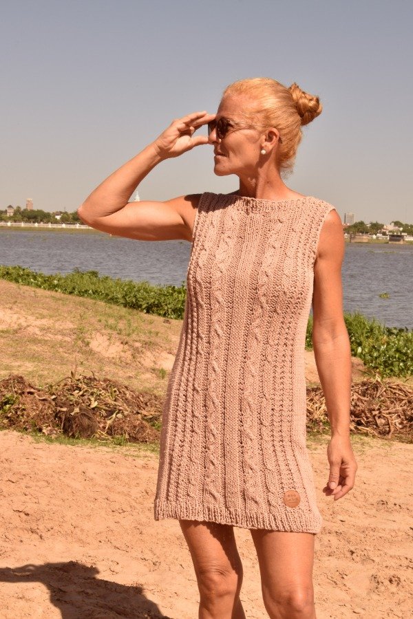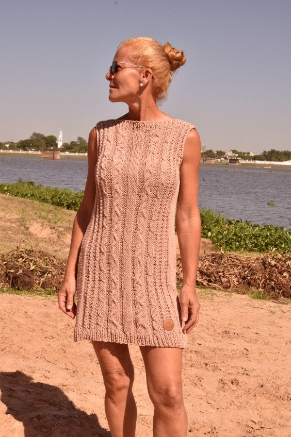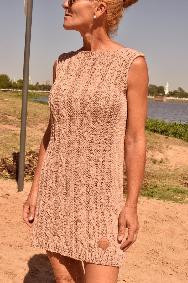 Vestido tejido A MANO, en hilo de algodón. Tiene escote bote con detalle de elástico que queda divino y le da amplitud. Punto de trenzas super fino que vamos cambiando para que nunca sean iguales. Es increíble la versatilidad de esta pieza, se puede usar de día, pero también de noche! Es una prenda increíble, hecha a mano, muy muy delicada. Las medidas en centímetros tomadas sobre una superficie plana son: ancho 47 cm como el vestido tiene punto de trenzas que es bien elástico, se estira hasta 57 cm (sin deformarse, de hecho más abierto, más se aprecia el trabajo del punto), alto de sisa 21/22 cm, largo total 82/83 cm. Podés comparar las medidas con las de algún vestido tuyo que te guste como te queda :)