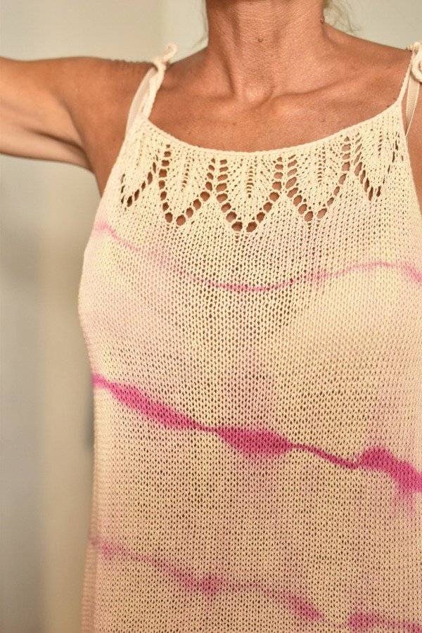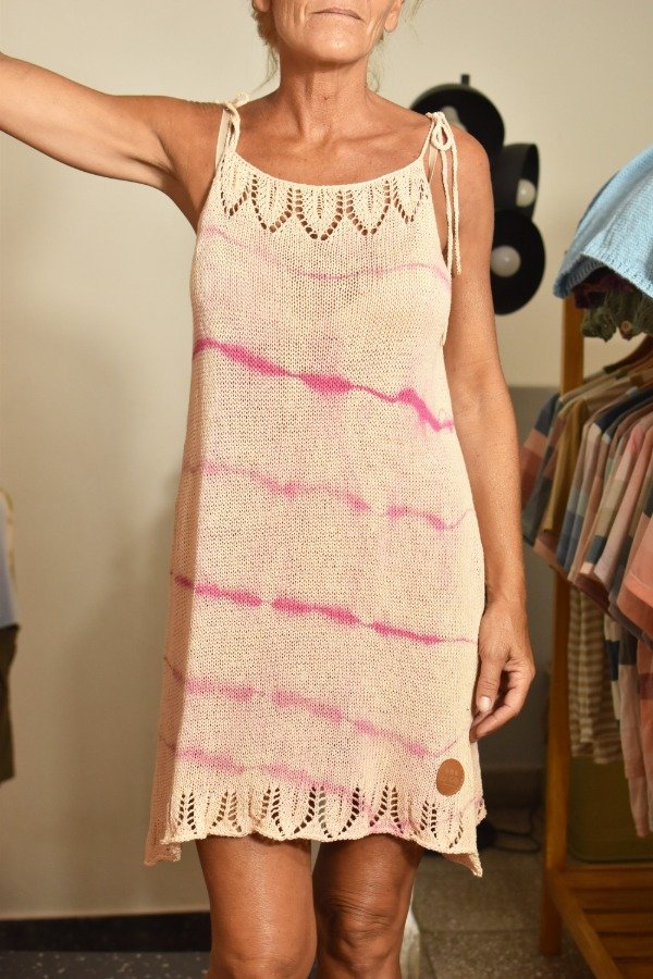 Vestido tejido con hilo fino de algodón super livianito y suave, detalles calados super super delicados en la parte de abajo y escote hechos artesanalmente. Tiras que se atan, por lo que son REGULABLES, podes darle el largo o escote que te guste! La forma es acampanada, es más holgado abajo y va disminuyendo hacia arriba, eso le da comodidad y frescura. Una prenda TOTALMENTE ÚNICA e IRREPETIBLE... REAL! Este vestido en particular fue teñido artesanalmente por nosotras, dando un resultado hermoso y ÚNICO, con colorcitos especiales para el verano! Las medidas en centímetros son sisa a sisa 51 cm, largo (SIN CONTAR TIRAS) 72 cm y ancho de cadera 53 cm (contorno de cadera 106 cm aprox).