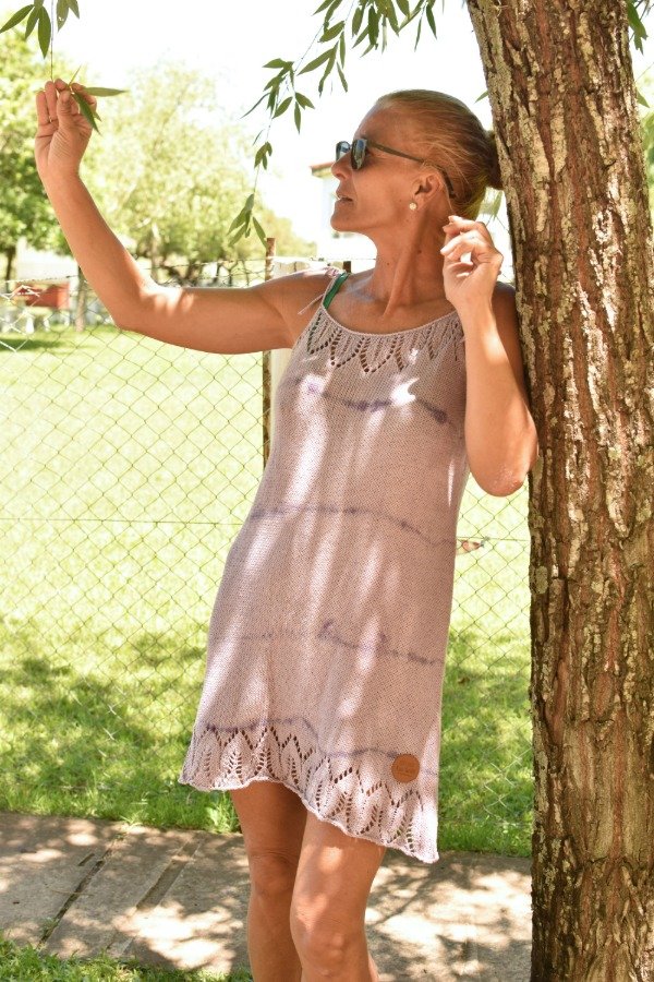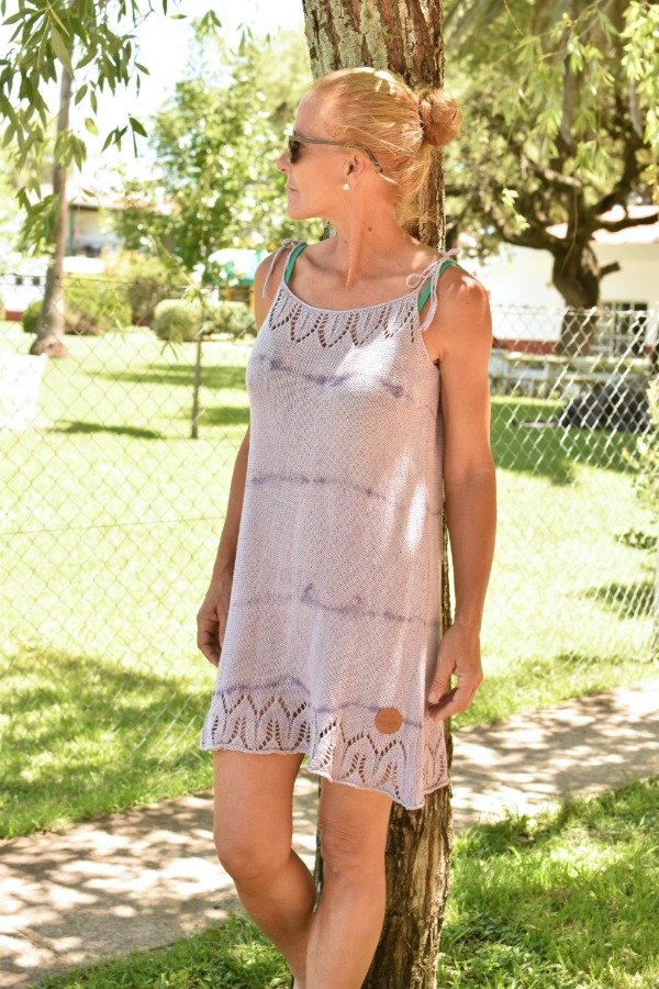 Vestido tejido con hilo fino de algodón super livinito y suave, detalles calados super super delicados en la parte de abajo y escote hechos artesanalmente. Tiras que se atan, por lo que son REGULABLES, podes darle el largo o escote que te guste! La forma es acampanada, es más holgado abajo y va disminuyendo hacia arriba, eso le da comodidad y frescura. Una prenda TOTALMENTE ÚNICA para ponerse en cualquier ocasión! Este vestido en particular fue teñido artesanalmente por nosotras, dando un resultado hermoso y ÚNICO, con colorcitos especiales para el verano! Las medidas en centímetros son sisa a sisa 44 cm, largo (SIN CONTAR TIRAS) 72 cm y ancho de cadera 51 cm (contorno de cadera 102 cm aprox).