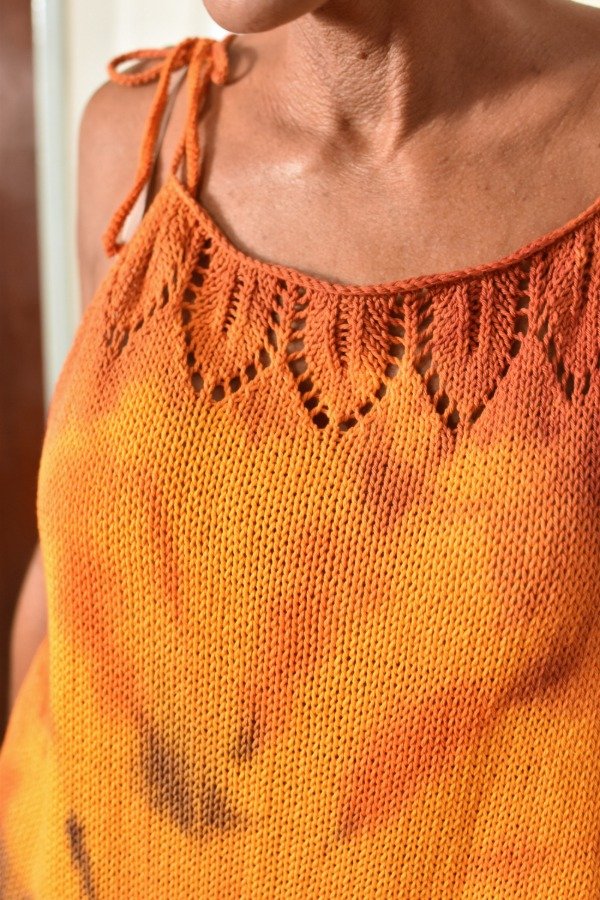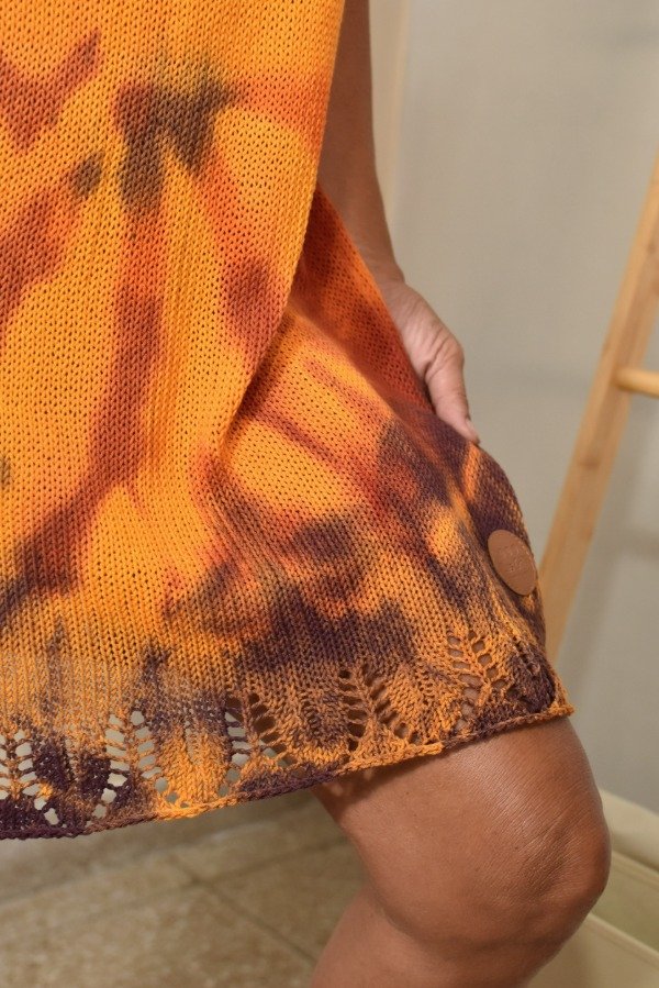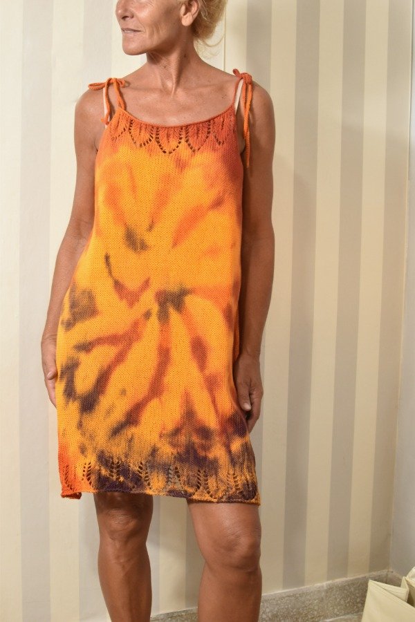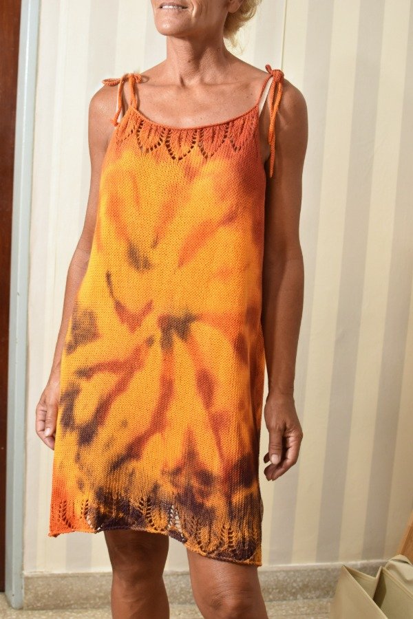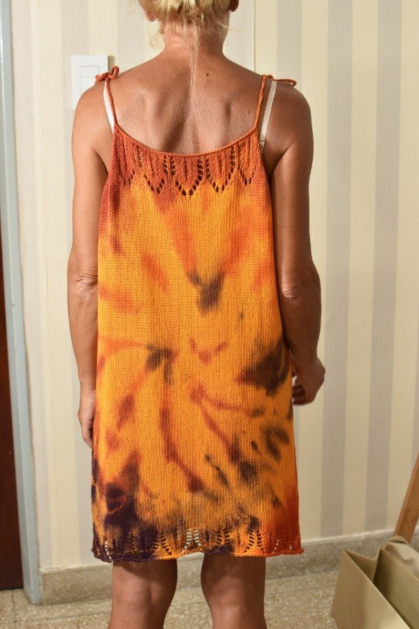 Vestido tejido con hilo fino de algodón super livinito y suave, detalles calados super super delicados en la parte de abajo y escote hechos artesanalmente. Tiras que se atan, por lo que son REGULABLES, podes darle el largo o escote que te guste! La forma es acampanada, es más holgado abajo y va disminuyendo hacia arriba, eso le da comodidad y frescura. Una prenda TOTALMENTE ÚNICA e IRREPETIBLE... REAL! Este vestido en particular fue teñido artesanalmente por nosotras, dando un resultado hermoso y ÚNICO, con colorcitos especiales para el verano! Las medidas en centímetros son sisa a sisa 58 cm, largo (SIN CONTAR TIRAS) 74 cm y ancho de cadera 60 cm (contorno de cadera 120 cm aprox).
