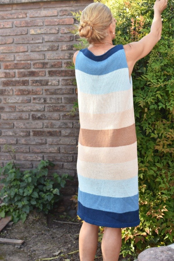 Vestido tejido en hilo de algodón fino, lo que hace que sea súper liviano y suave. Posee dobladillo en la parte de abajo y terminaciones en crochet. Este modelo es un poco acampanado, es decir es más holgado abajo y va disminuyendo hacia arriba. Prenda IDEAL para cualquier ocasión y además, ÚNICA, te viste. Este modelo tiene un diseño que NO FALLA, los colores espejados! Las medidas en centímetros son sisa a sisa 50 cm, alto de sisa 23 cm, ancho de cadera 58 cm (contorno de cadera 116 aprox), largo total de la prenda 97 aprox. Podés comparar con la medidas de algún vestido que te guste como te queda! La letra de talle es estimativa, una guía.